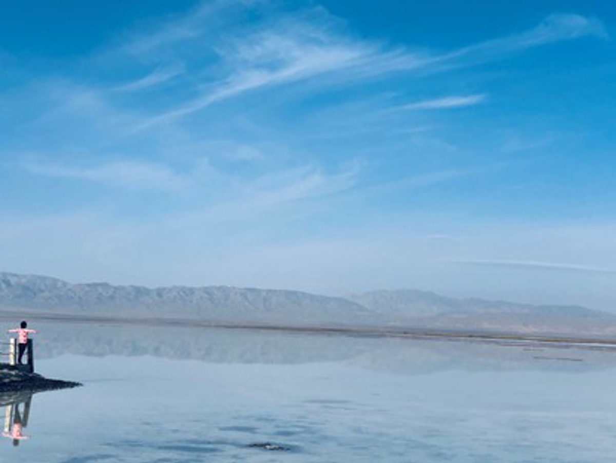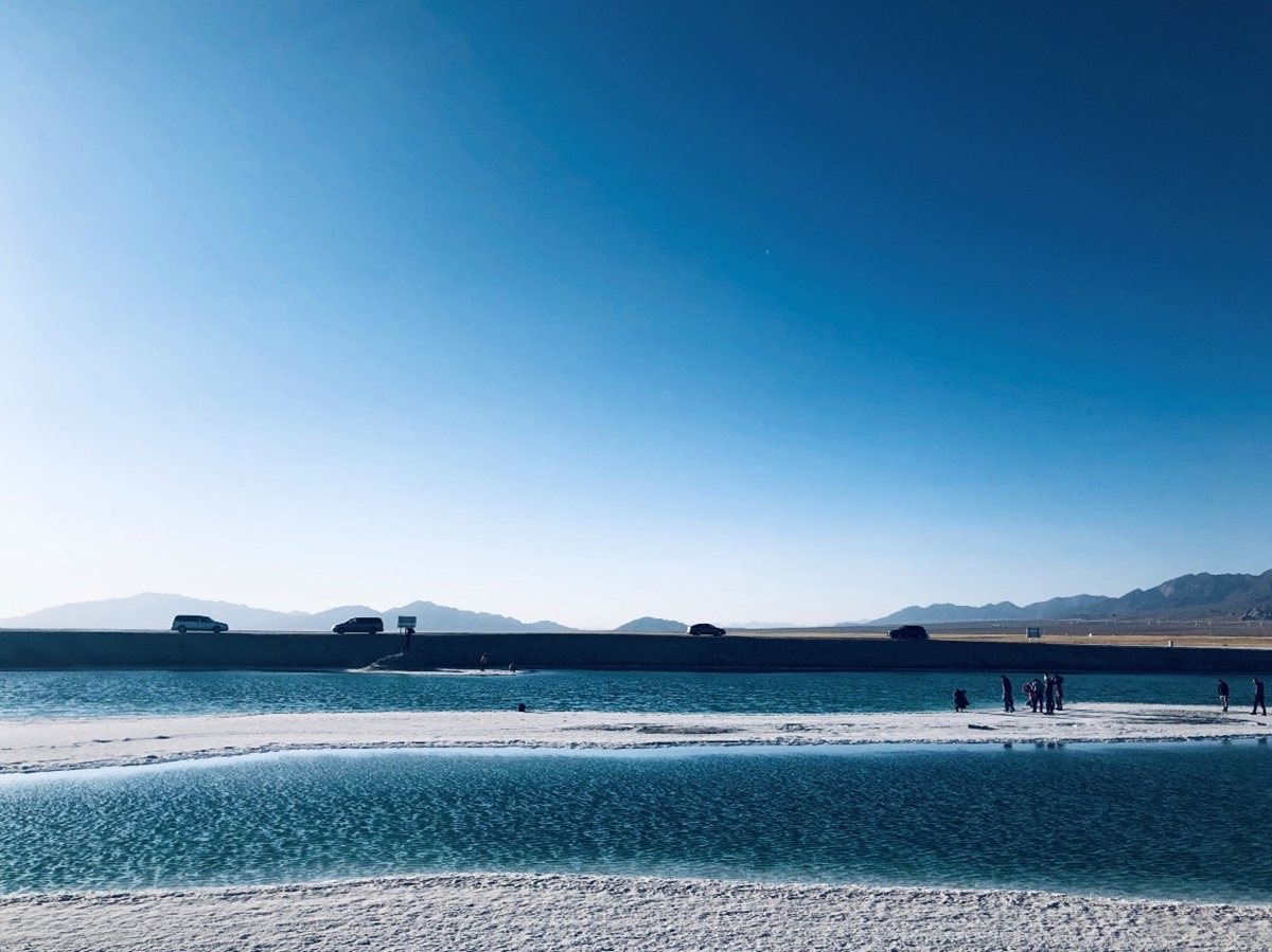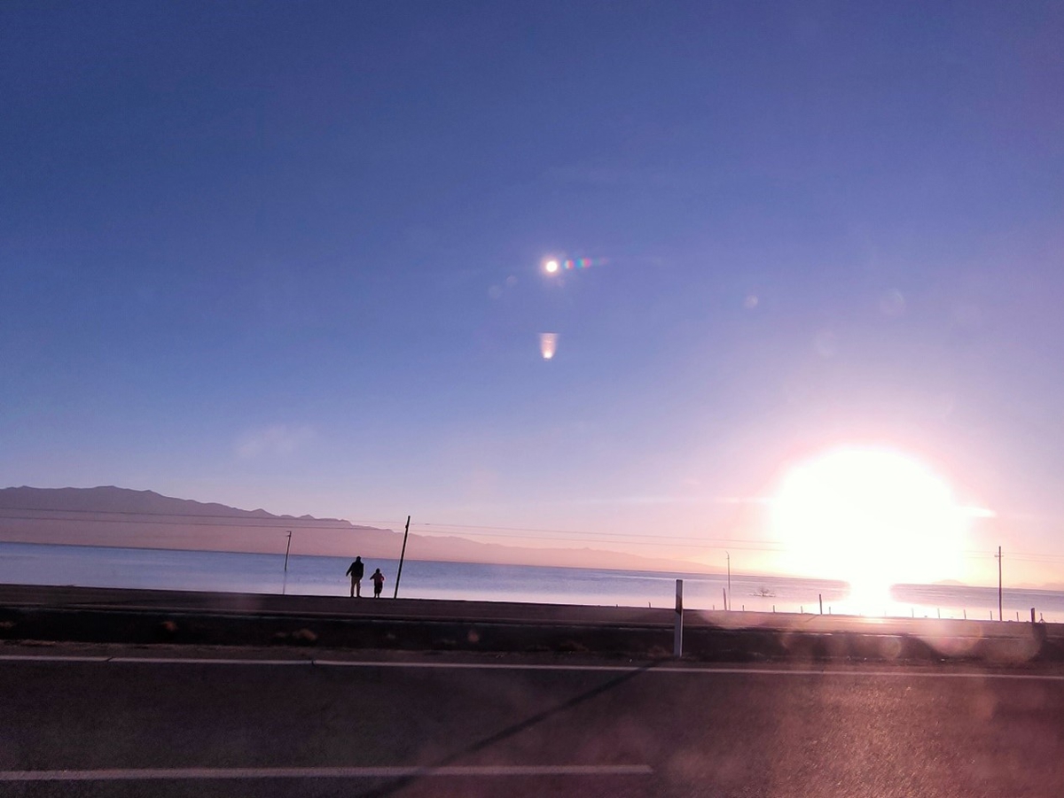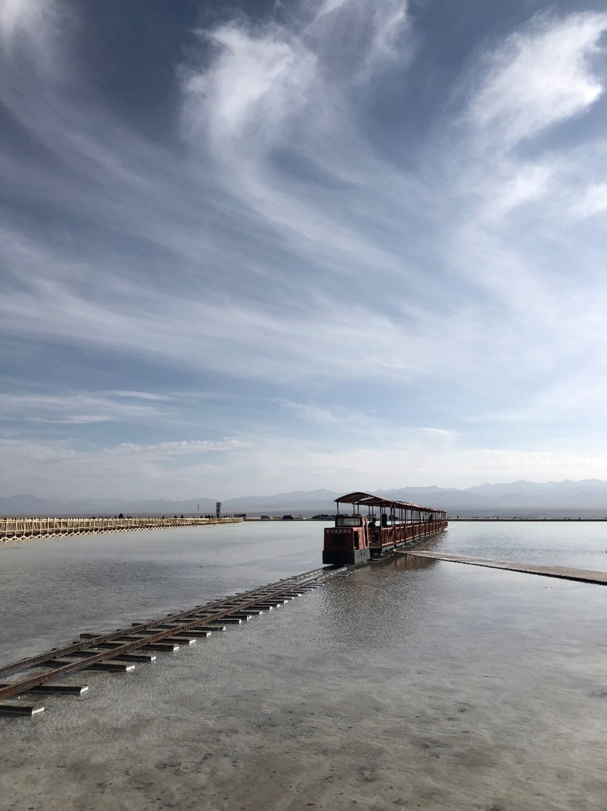 Since sunset isn't until 8:30 PM in these parts, we had time to visit Chaka Sky No.1 (茶卡天空壹号), a newer scenic area about 20km from Chaka Salt Lake (茶卡盐湖). Similar to the famous salt lake but less crowded. We walked through the quiet train parked in the middle of the lake - hauntingly beautiful.