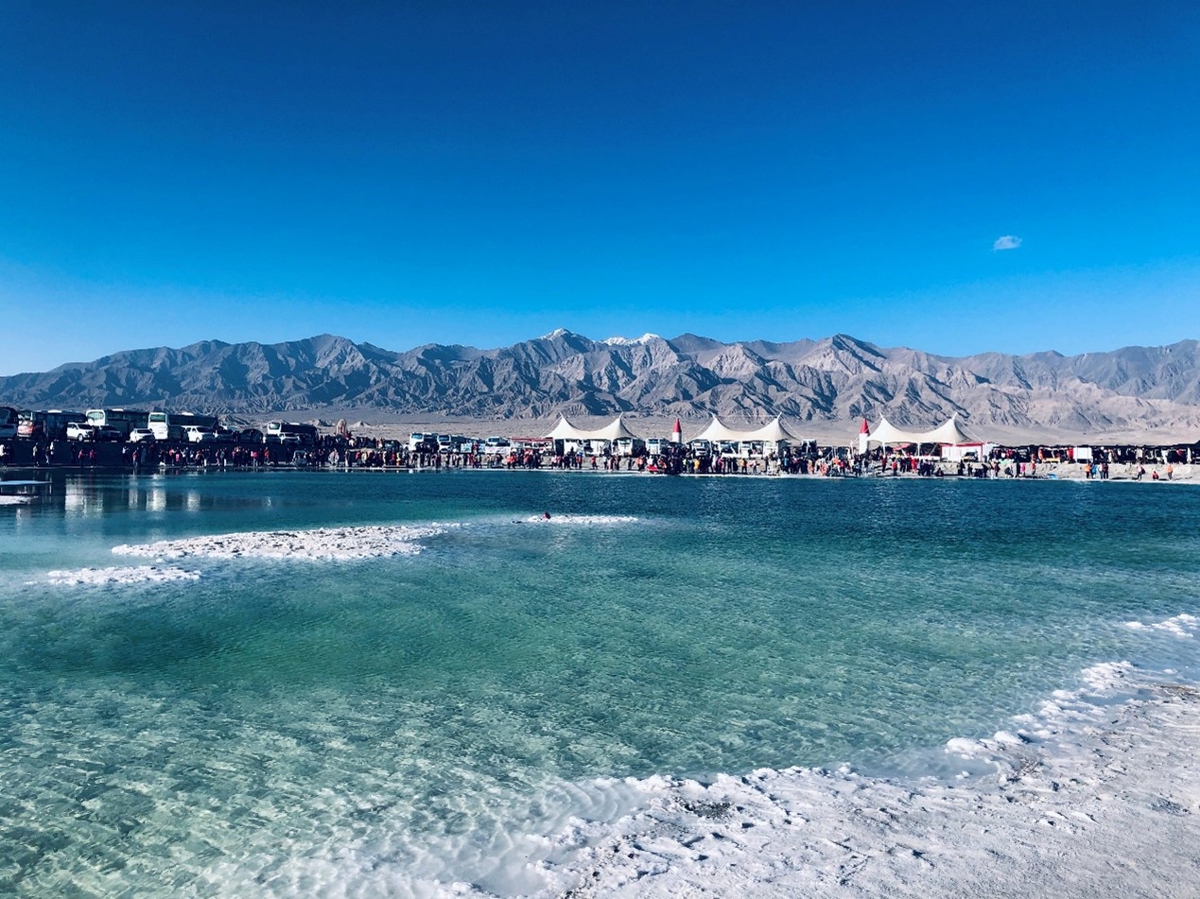 Chaka Salt Lake (茶卡盐湖) is best visited early morning or late afternoon - harsh midday sun flattens the reflections. We arrived at opening and caught stunning mirror-like surfaces. The scenic area is huge - take the tourist train directly to the center rather than walking the crowded outer sections.