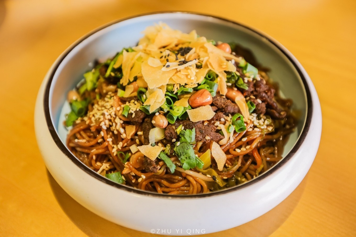 We also tried Hainan Rice Noodles (海南粉, Hǎinán Fěn)—thinner than typical noodles and tossed with fried peanuts, sesame seeds, bean sprouts, scallions, pork strips, and pickled vegetables. Like a noodle salad, the thin strands absorbed all the flavors beautifully.