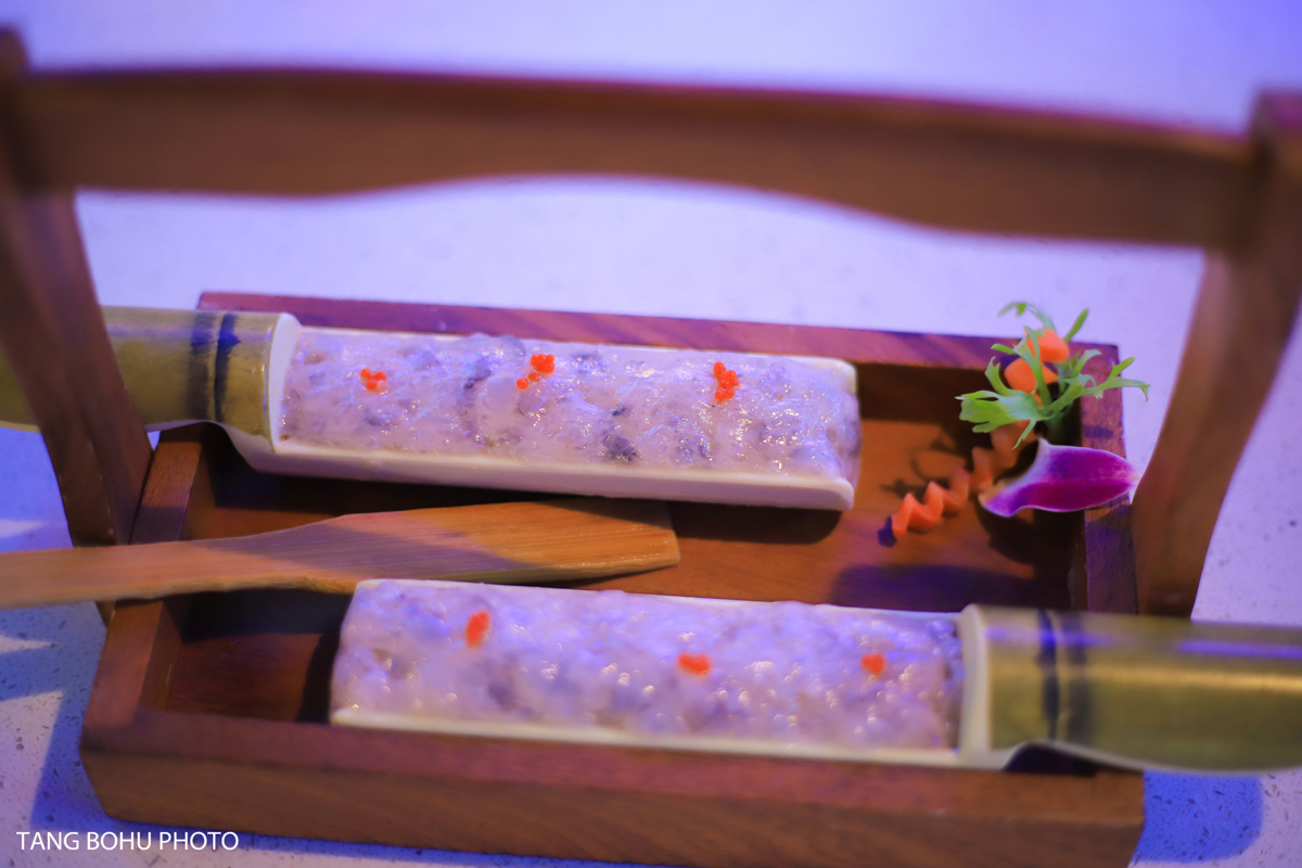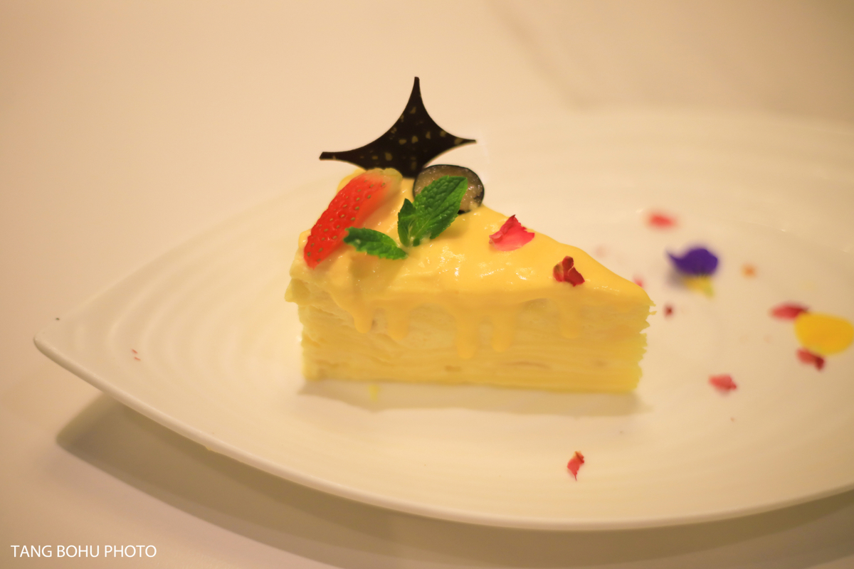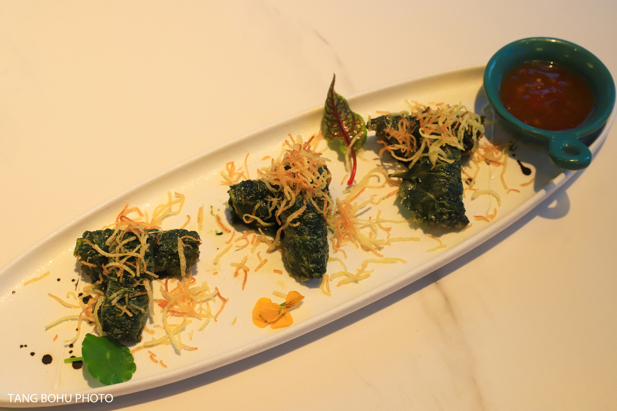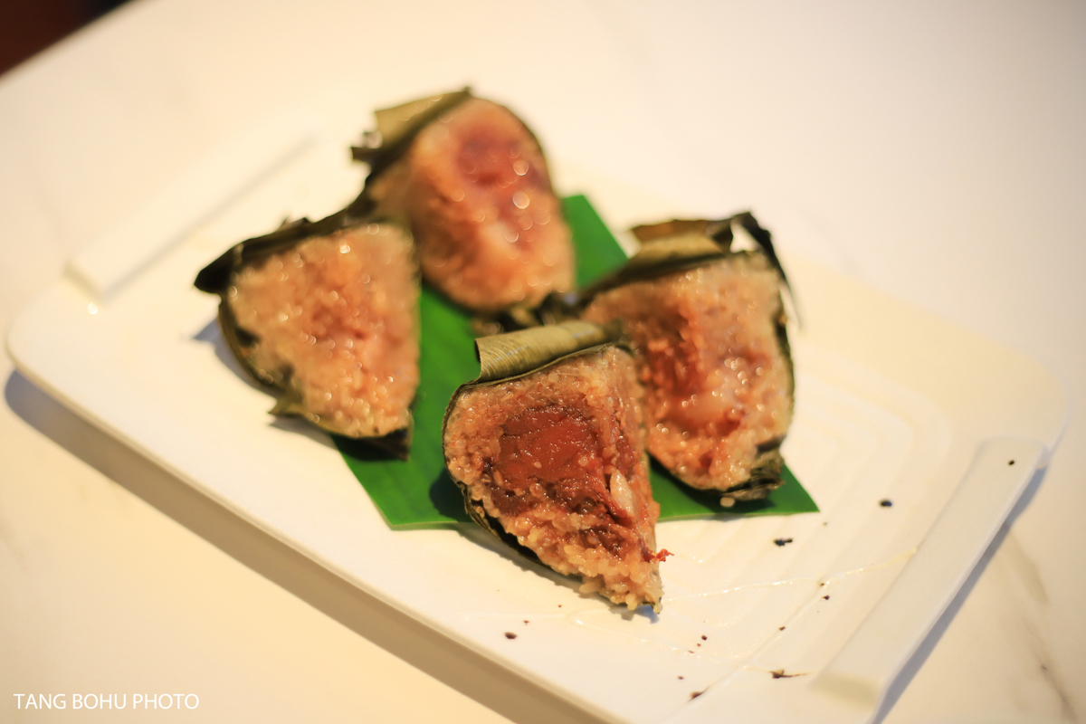 Other highlights included the Ding'an Black Pork Rice Dumplings—similar to Fujian-style savory zongzi but with a unique fragrant twist using locally raised black pork and salted duck egg yolks. The sweet potato leaves with shrimp paste were tender and flavorful, though a bit on the salty side. For dessert, the durian mille crepe cake was a dream come true for this durian lover—delicate layers of crepe and fresh durian cream that looked as beautiful as it tasted.