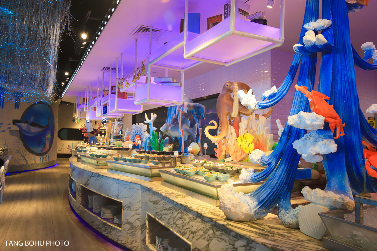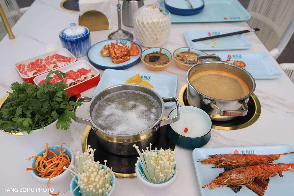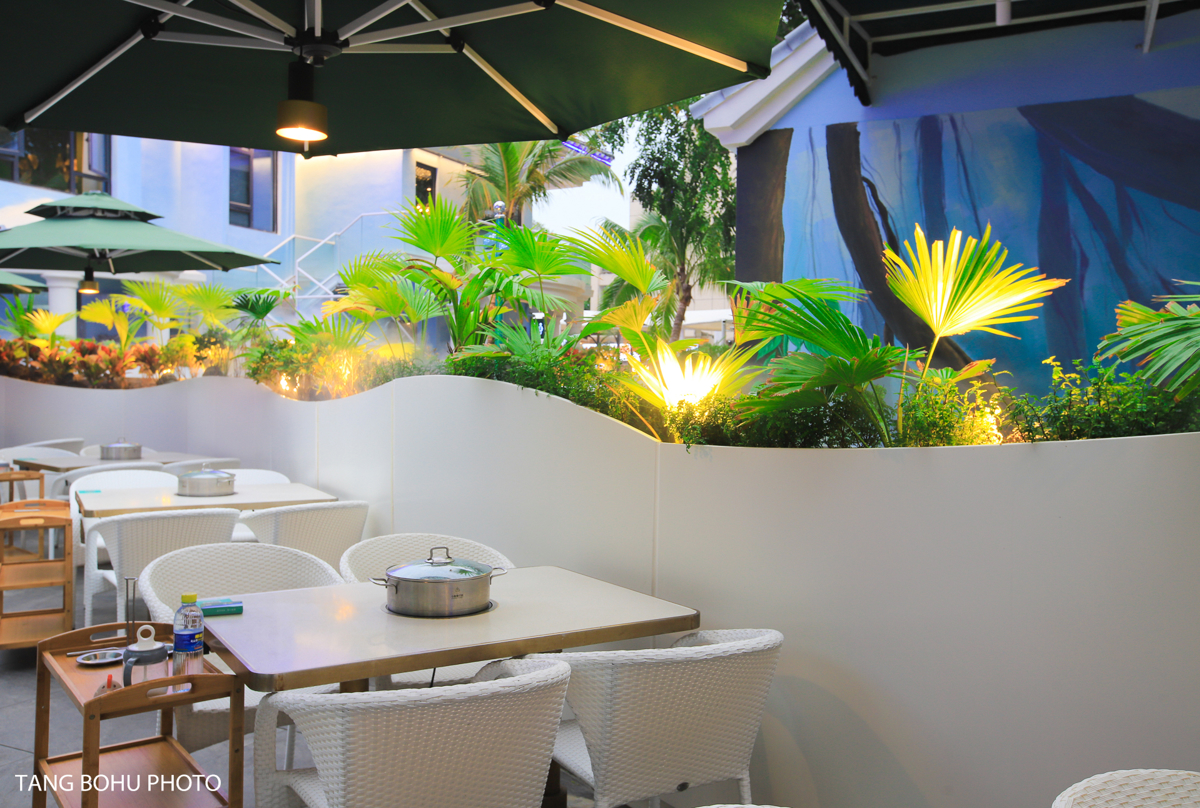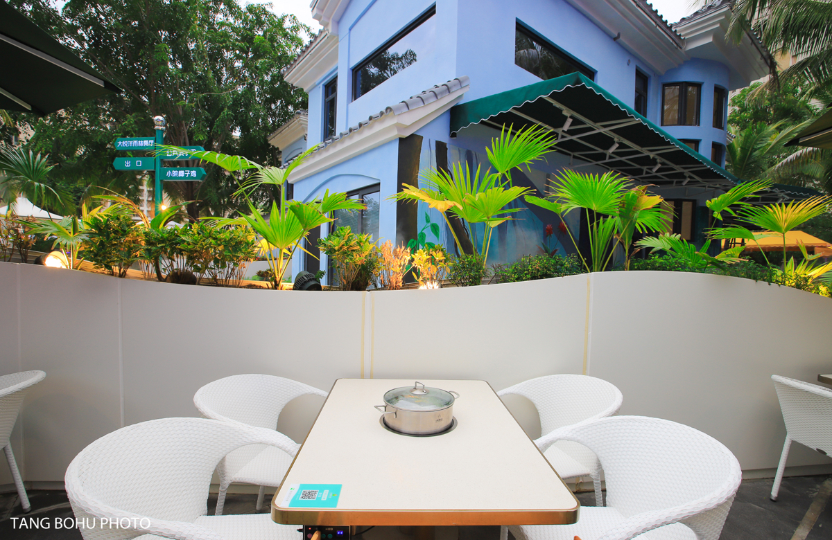 The restaurant's design is stunning—blue and white color schemes with tropical accents, romantic purple lighting in the evening, and even a treehouse on the second floor overlooking the entire buffet spread. Individual hot pots allowed me to cook seafood to my liking, with broth options including clear, spicy, and the local 'zao po cu' (fermented rice vinegar) flavor.
