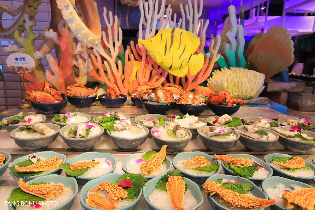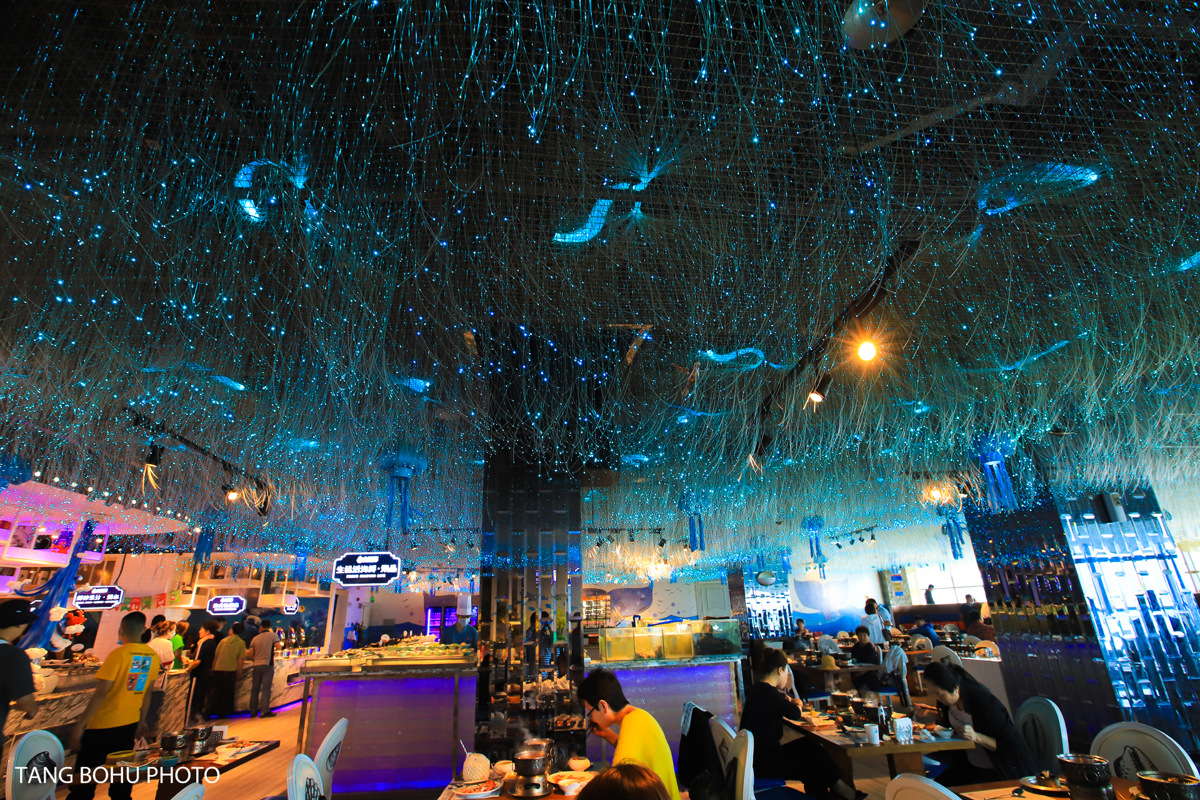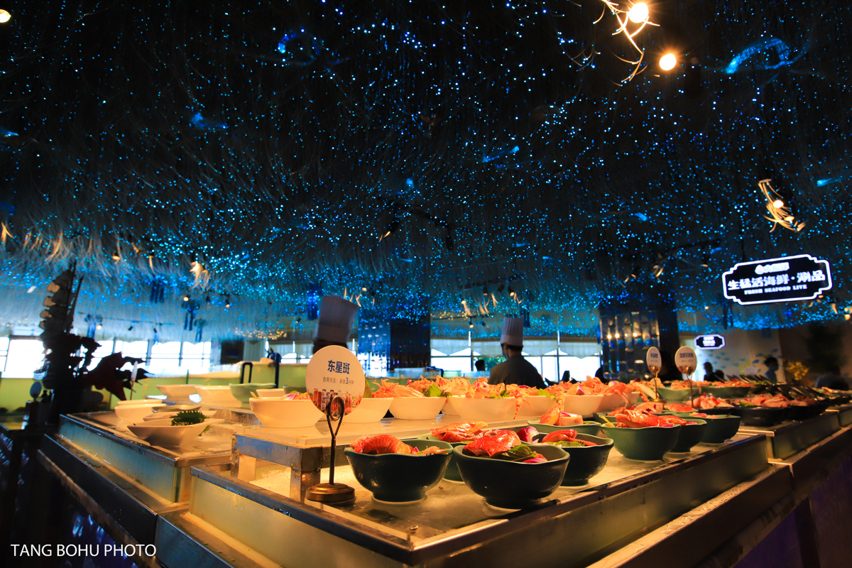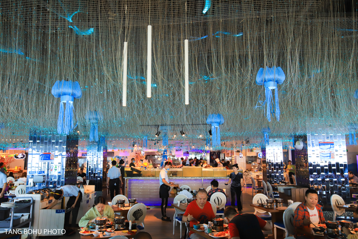 For my final dinner, I splurged at Dayangyang Ocean Restaurant (Dà Yáng Yáng Hǎiyáng Cāntīng) at Harbor City 1, and it was worth every yuan. The restaurant offers stunning ocean views of Dadonghai Beach through floor-to-ceiling windows, creating a romantic atmosphere enhanced by blue starlight ceiling fixtures that made me feel like I was dining under the sea.