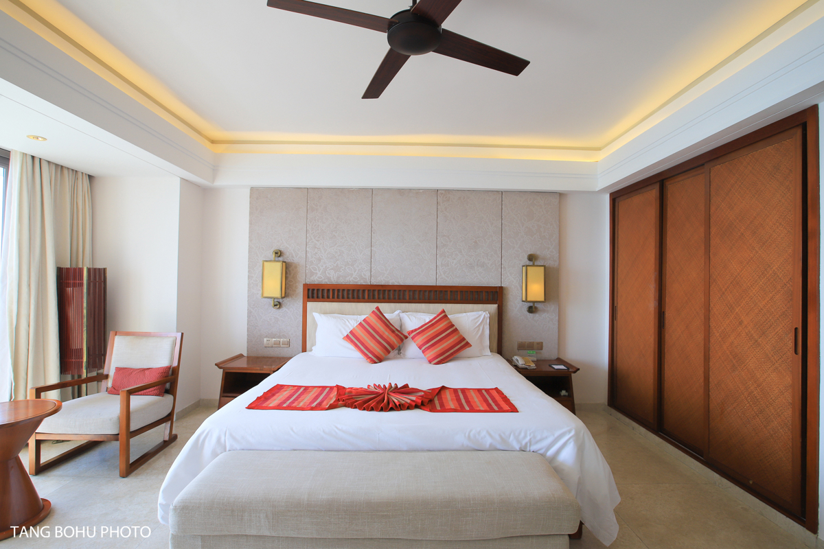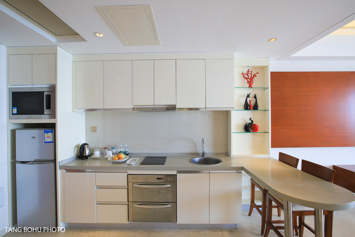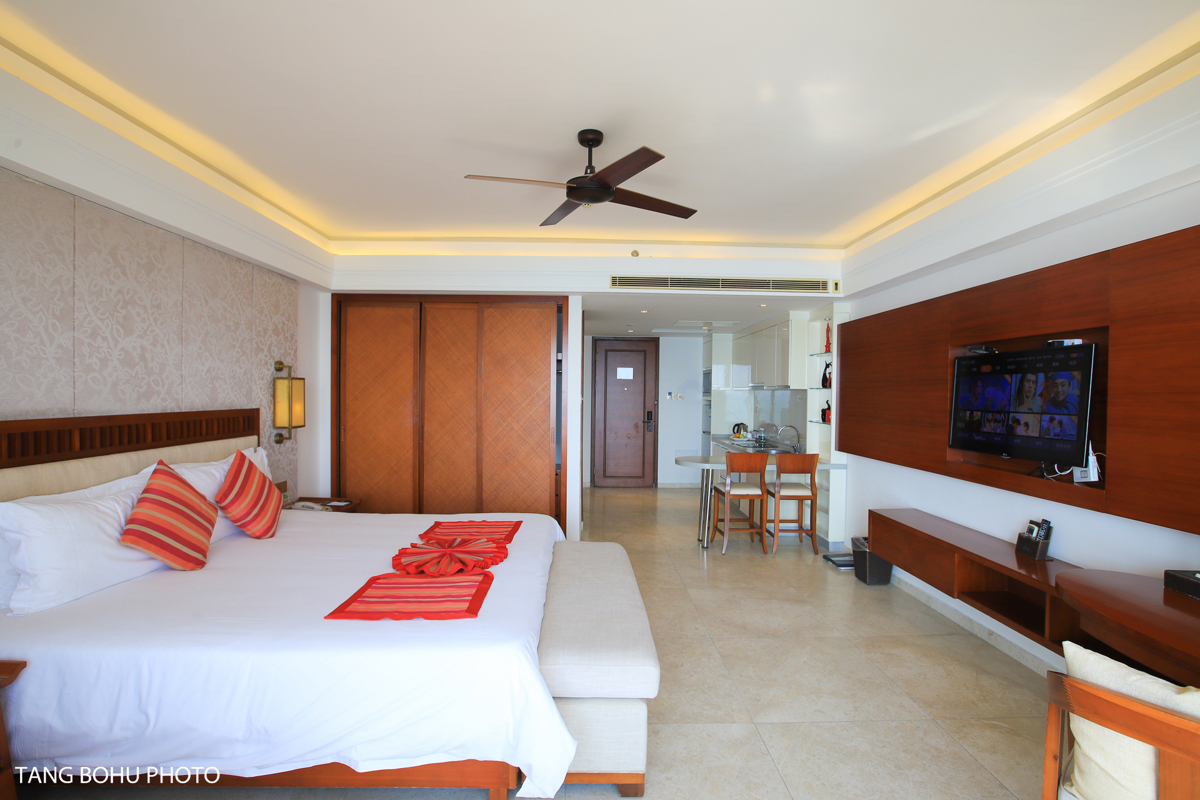 I stayed in the 180-degree Supreme Ocean View Room, and waking up to panoramic views of Sanya Bay never got old. The room was spacious with a massive balcony featuring a clothes-drying rack—surprisingly useful after beach days. The king-size bed could easily sleep three people, making it perfect for families. The open-concept kitchen came equipped with a refrigerator, microwave, and oven, plus a small bar area.