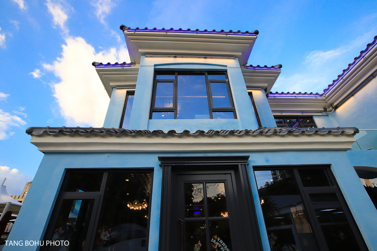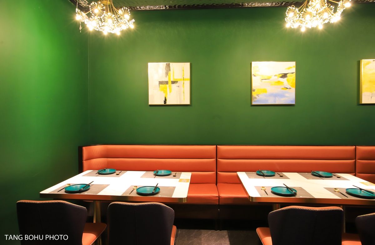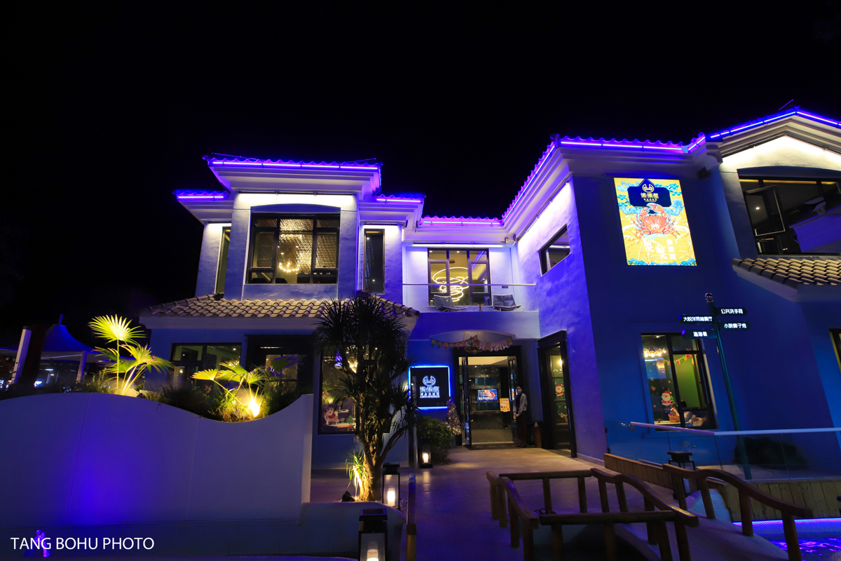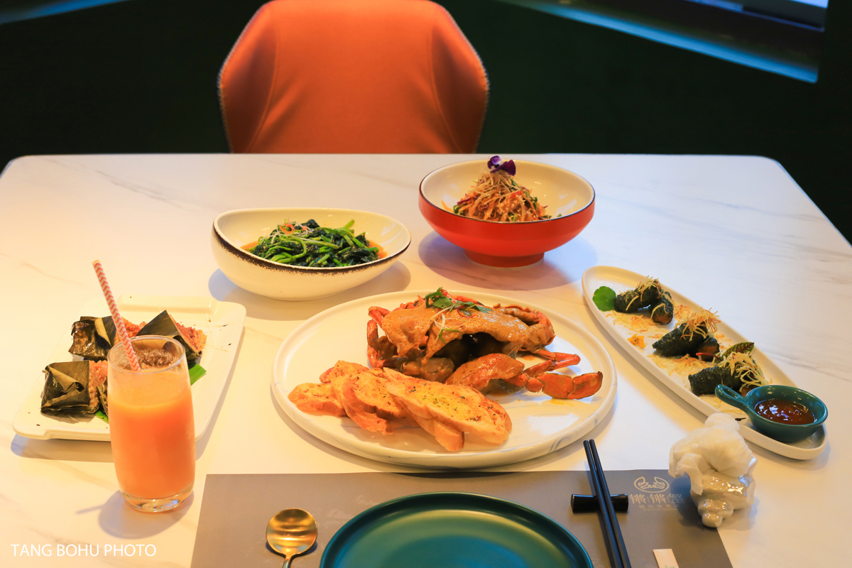 Next door to the buffet, I discovered Qiangqiang Crab (Qiāng Qiāng Xiè), one of Sanya's hottest new restaurants. The moment I saw the striking blue villa exterior, I knew this would be special. Inside, the décor blew me away—luxurious green interiors blending Hainan local elements with Southeast Asian influences.