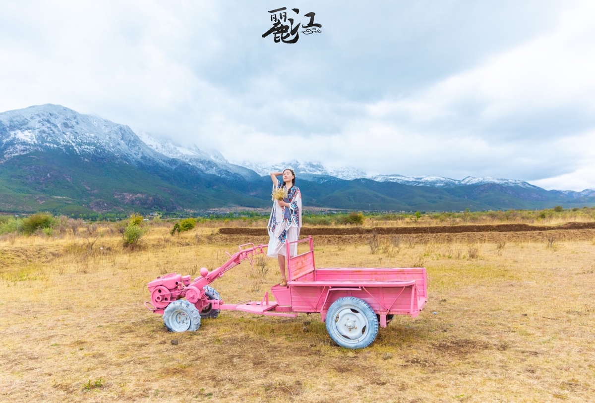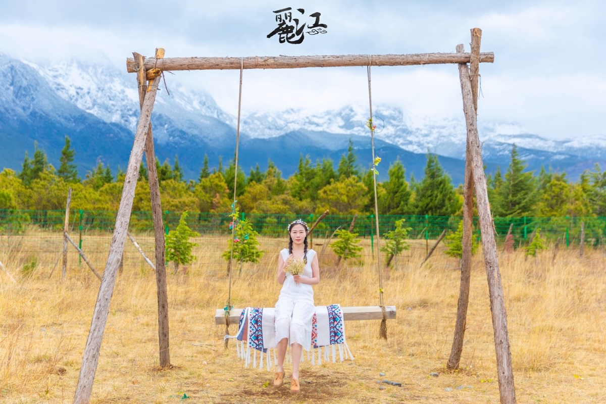 The location of these photography bases is excellent—Snow Mountain is right behind. That's why many tourists come specifically from other places to take wedding photos. There are many scenes: boats, swings, bathtubs, and various small cars.