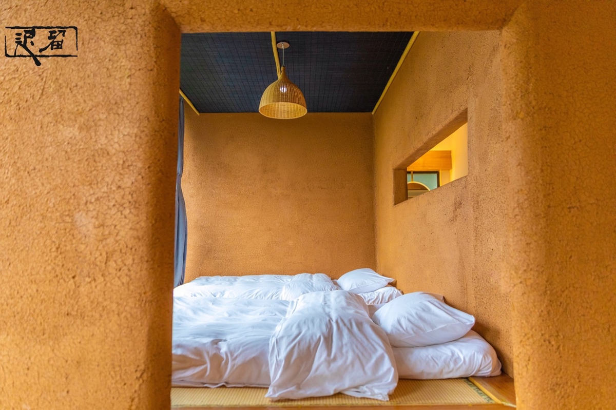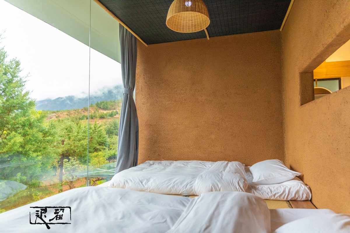 Besides the large bed, there are two tatami mats. The full floor-to-ceiling window design looks out to distant mountains. The hotel owner wants to bring people's body and mind from the city to a more rustic, natural village in a return to origin—between looking up and down, there's only heaven and earth.