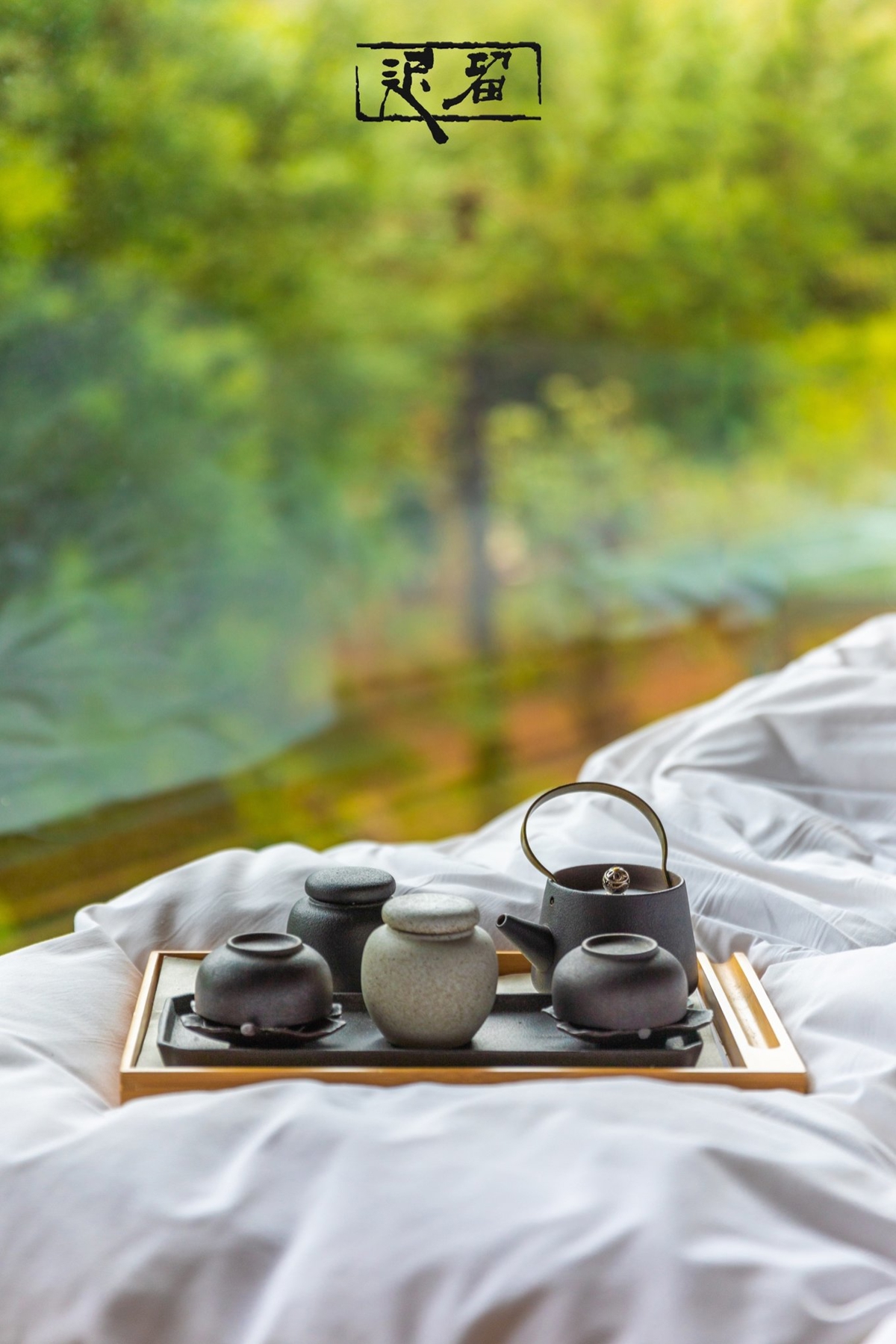 Sitting in an ancient Zen tea room, tasting tea, viewing the mountain, nurturing the heart—a leisurely afternoon. A卷书 (book), a cup of tea, a window of green-stained mood—time passes so slowly.