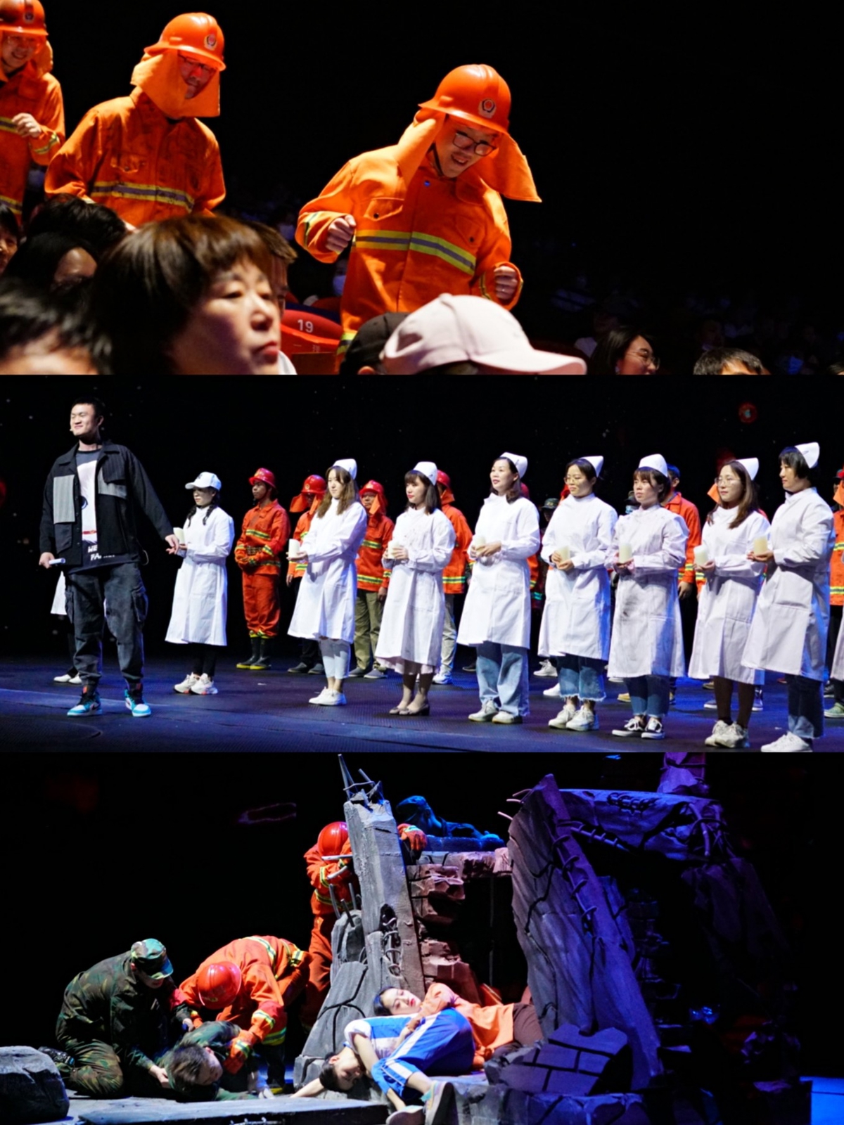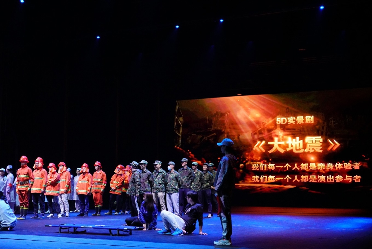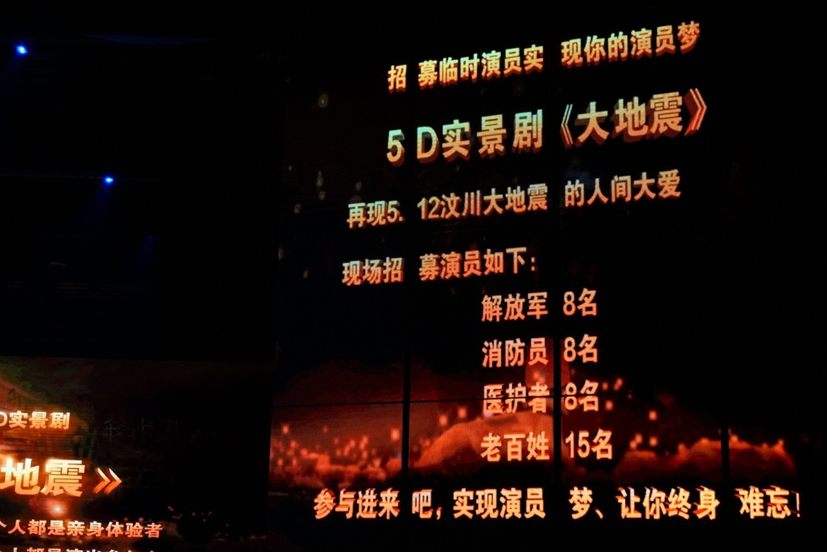 运用5D高科技手段再现了512汶川大地震的惨烈场面,运用5D high-tech手段再现了the 2008 Wenchuan earthquake. Mountain collapses, houses crumble, the entire theater and thousands of seats shake violently, and 3,000 tons of water flood down. Real stories, touching moments, showing the unity of the Chinese people in disaster relief.