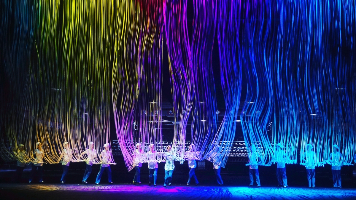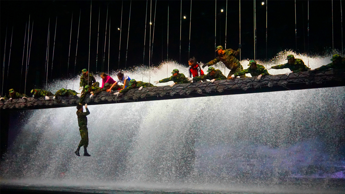 Then came the moment that made my jaw drop—3,000 tons of Huangpu River water dramatically poured onto the stage, creating a massive cascade that felt almost overwhelming in its scale. And if that wasn't spectacular enough, a 400-square-meter transparent membrane descended from the ceiling, creating an otherworldly visual effect.