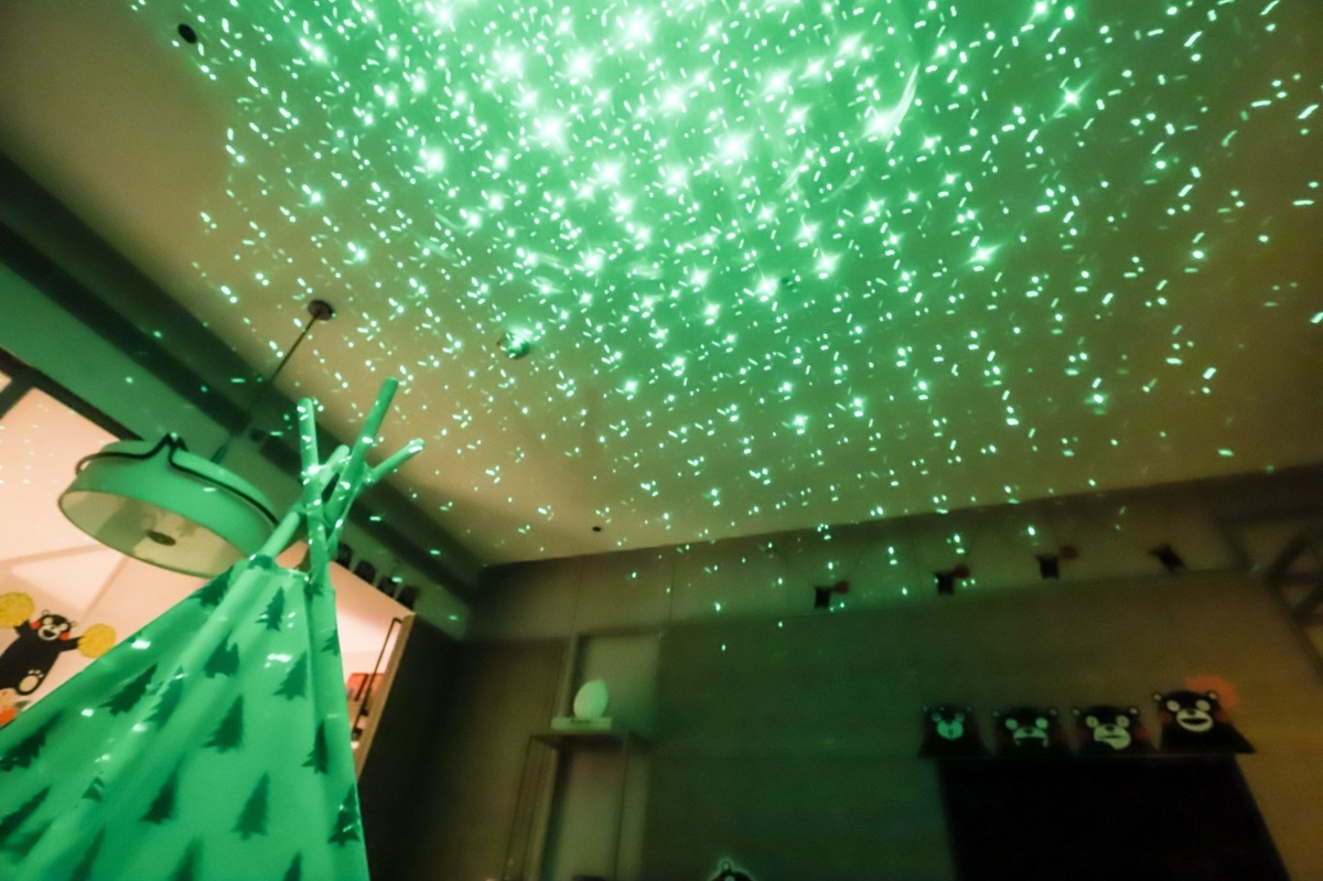 Before sleep, we turned on the projection lamp and watched in wonder as the ceiling filled with twinkling stars, creating an atmosphere of cosmic depth that made us feel like we were floating among galaxies.