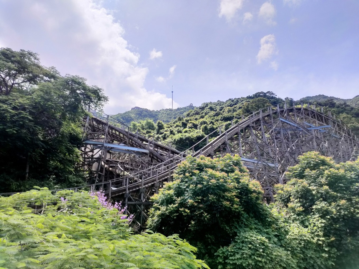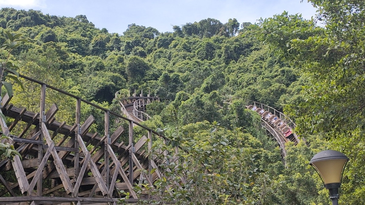 The Grand Canyon has various thrilling rides. Rapids (激流勇进), Forest Shuttle, and Wooden Roller Coaster are the highlights. If you're brave enough, you MUST try it! Speeding between valleys and slopes, sometimes hidden in the forest, sometimes floating above clouds—super interesting.