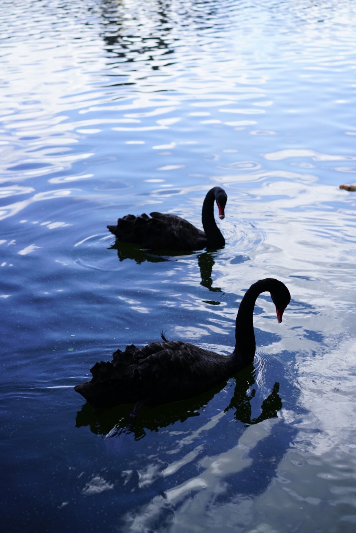 Pigeons fly around, black swans play happily in the water. Kids by the lake watch koi fish, and the swans seem to hear their cheers, flapping wings to come closer. A beautiful scene of human-animal harmony.
