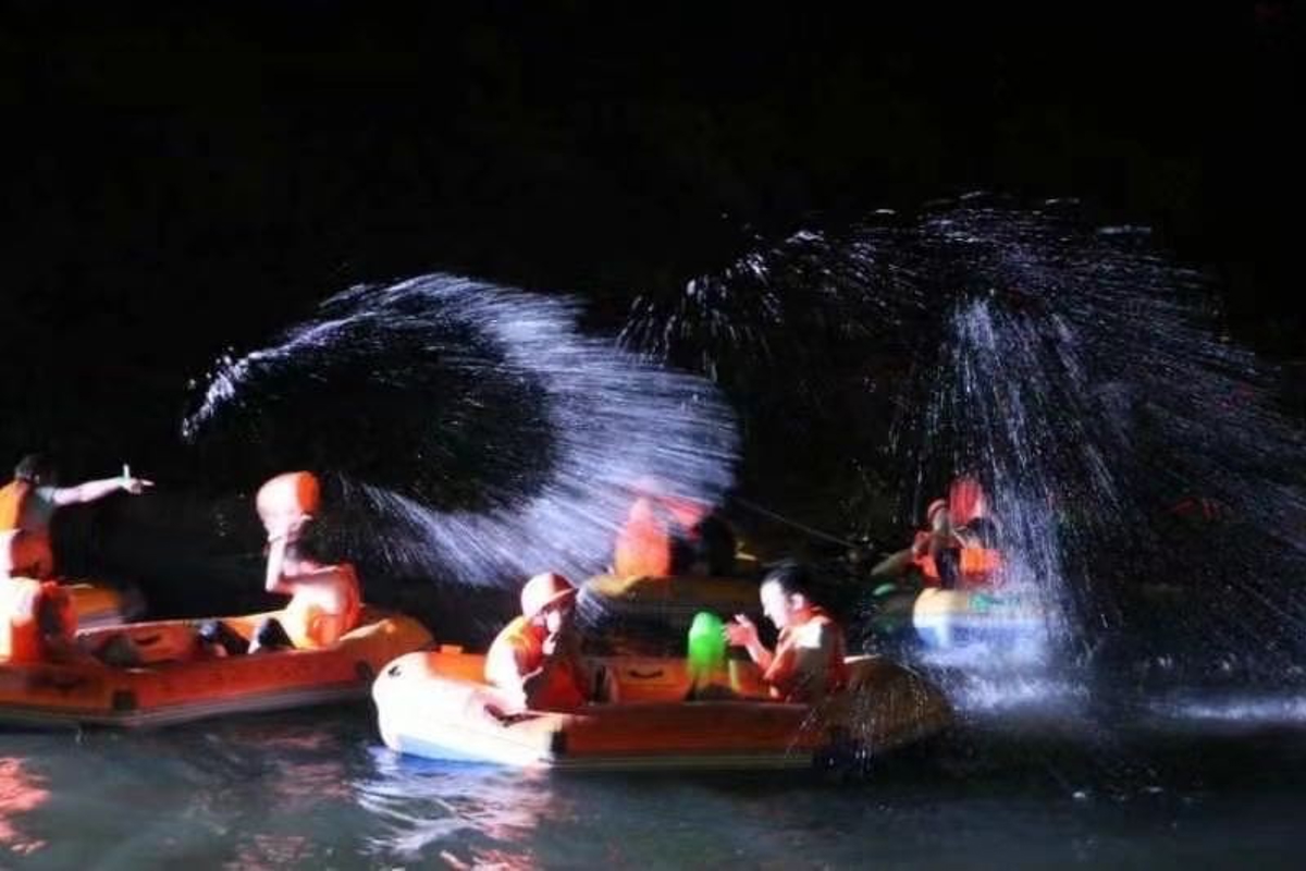 First activity: rafting on the Juma River (拒马河漂流). The setup uses the ancient riverbed cutting through Taihang Mountain canyons, creating a 3km course that takes about an hour. It's not whitewater adrenaline—think scenic float with occasional splashes rather than extreme sports. Perfect for groups who want to relax and spray each other with water guns.