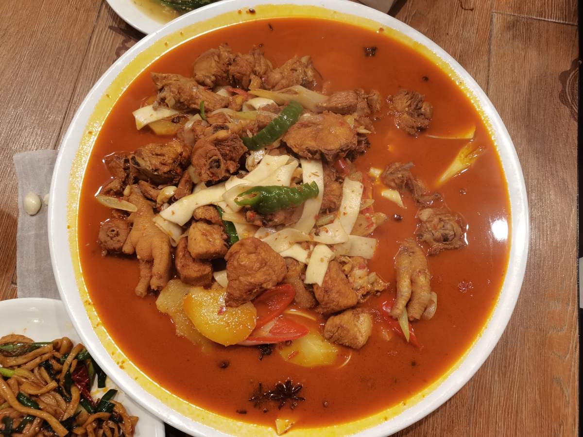 The Hui family—son and mother—greeted us with warm smiles and recommended their specialty: Big Plate Chicken (大盘鸡). When it arrived, it practically covered the entire table. Massive portions, though no alcohol due to religious customs. We ate happily anyway.