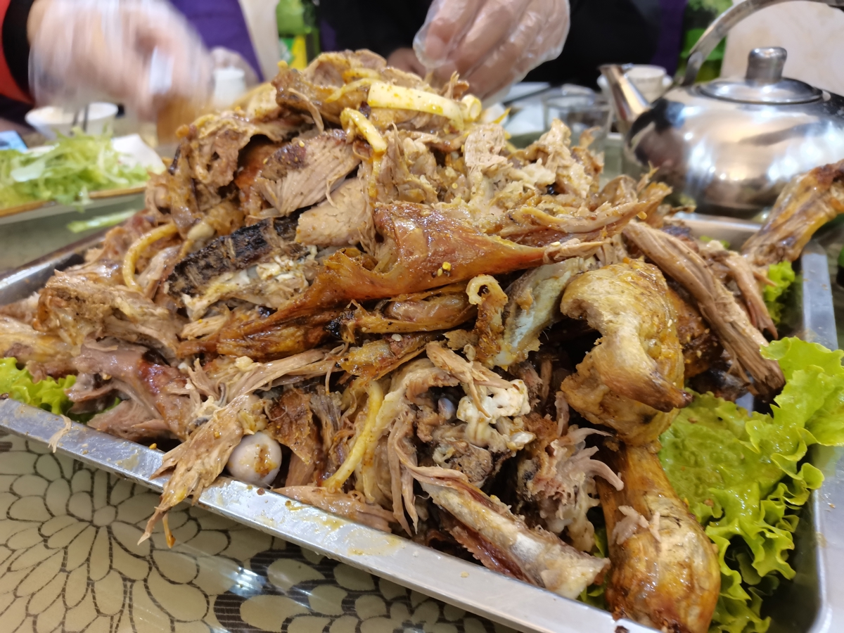 The lamb roasted in an earthen oven with fruit wood for 3-4 hours. Crispy skin, tender meat, no mutton smell, natural fruit fragrance. Delicious. Different from the lamb skewers we had in Lanzhou—this flavors depends on regional ingredients. Back in Jingmen, even our roast lamb can't replicate this taste.