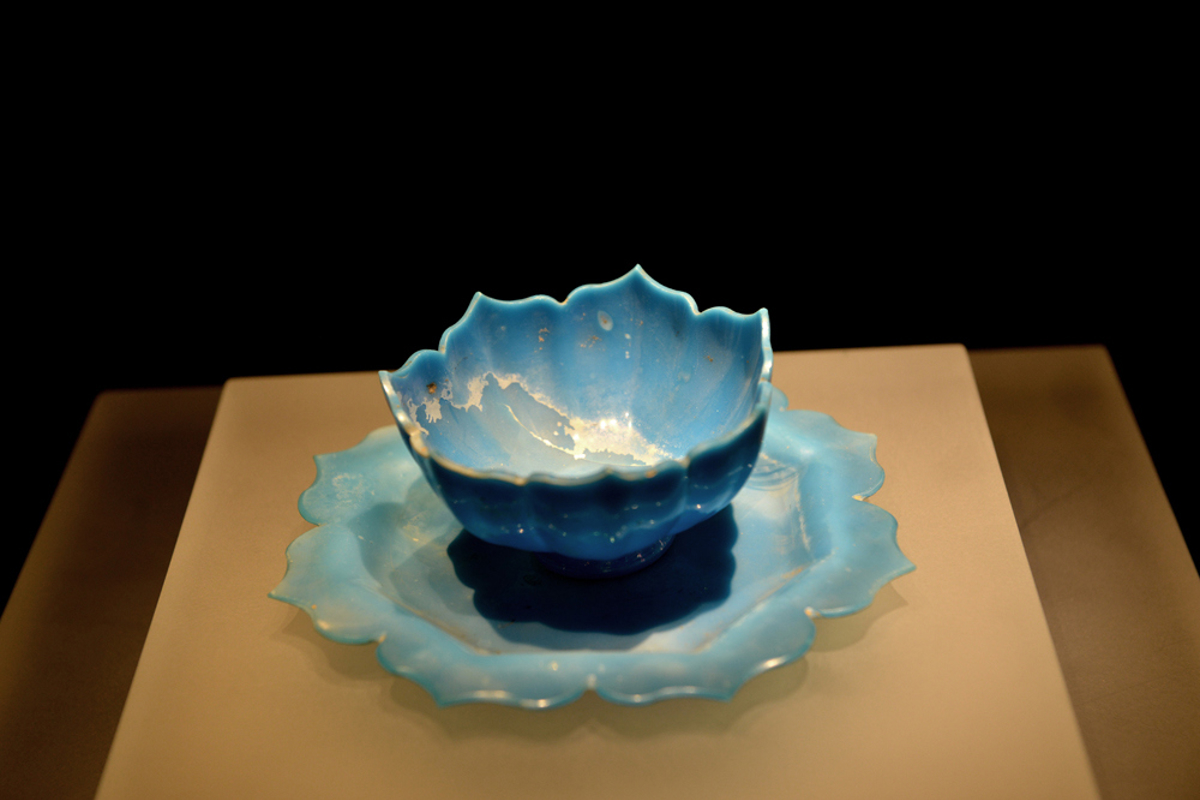Another showstopper: a blue glass lotus-shaped cup (玻璃托盏) from the Yuan Dynasty. Some say it's Central Asian in origin; others claim it's Chinese-made using Islamic glass techniques. Either way, it's exquisitely delicate—I'd love brewing tea in it.