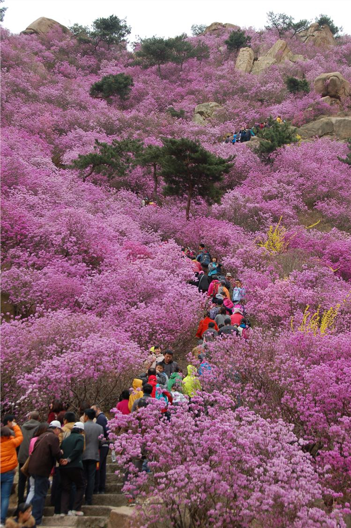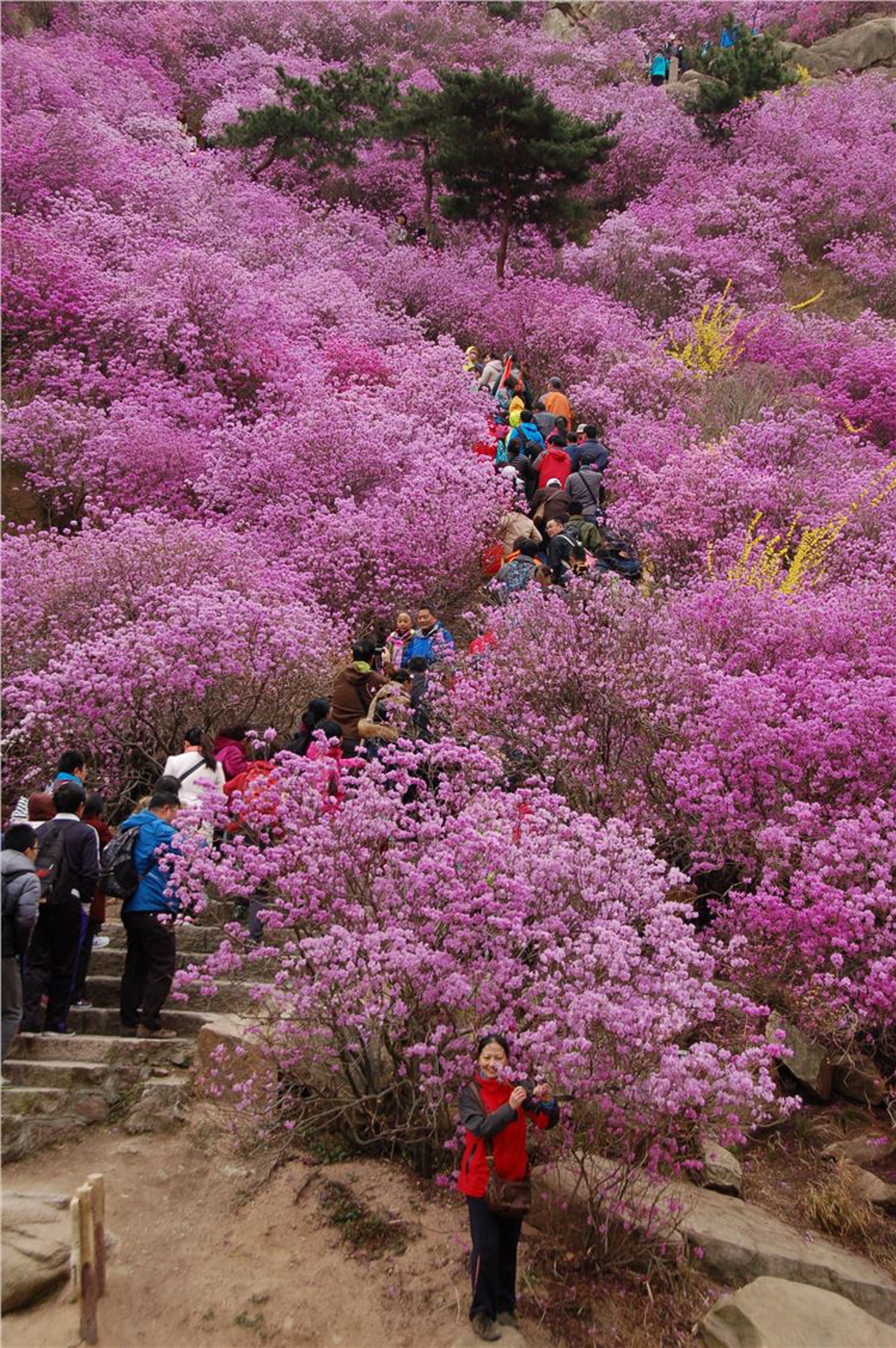 Hiking about 3 kilometers along wooden planks and stone steps, we started spotting clusters of azaleas on the left mountain slope.