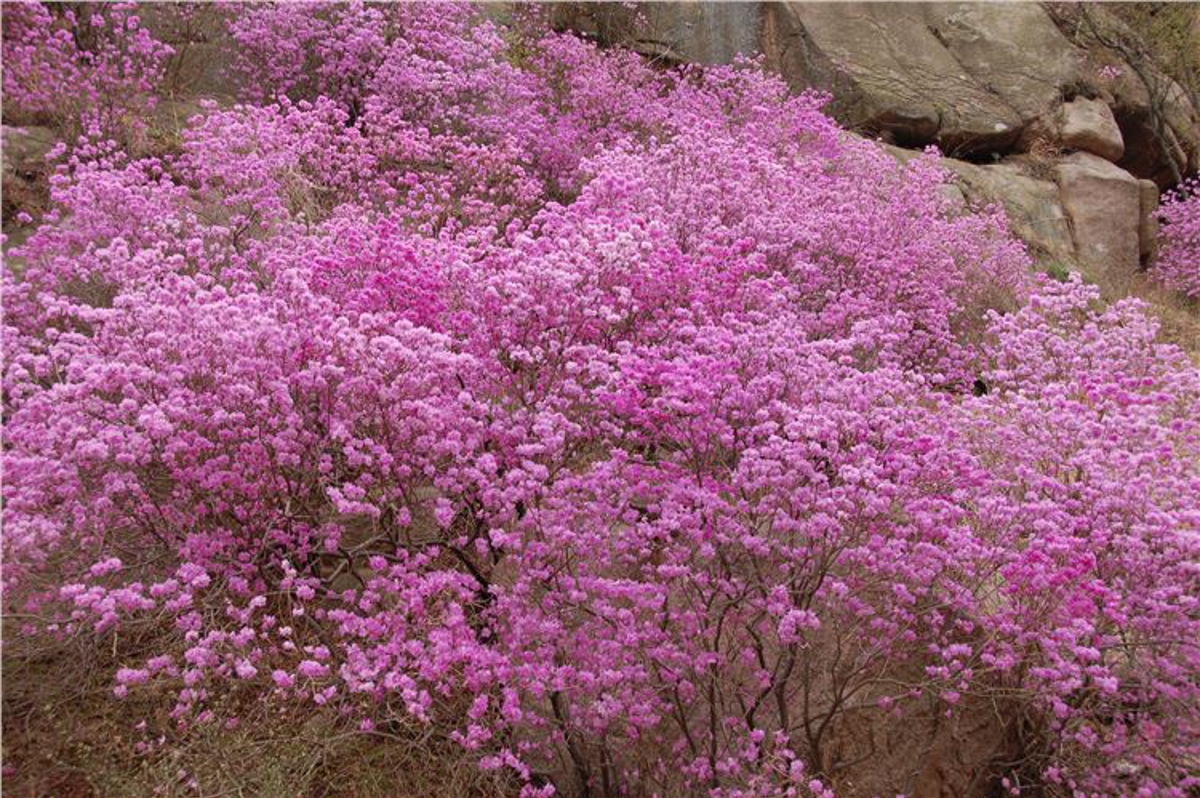 The mountain has three azalea varieties: Lanjingzi (蓝荆子), Yingzanhong (映山红), and Kongtonghua (崆峒花). During our visit in early April, the Lanjingzi was in full bloom - the earliest, most widespread, and largest azalea variety, blooming through mid-to-late April.