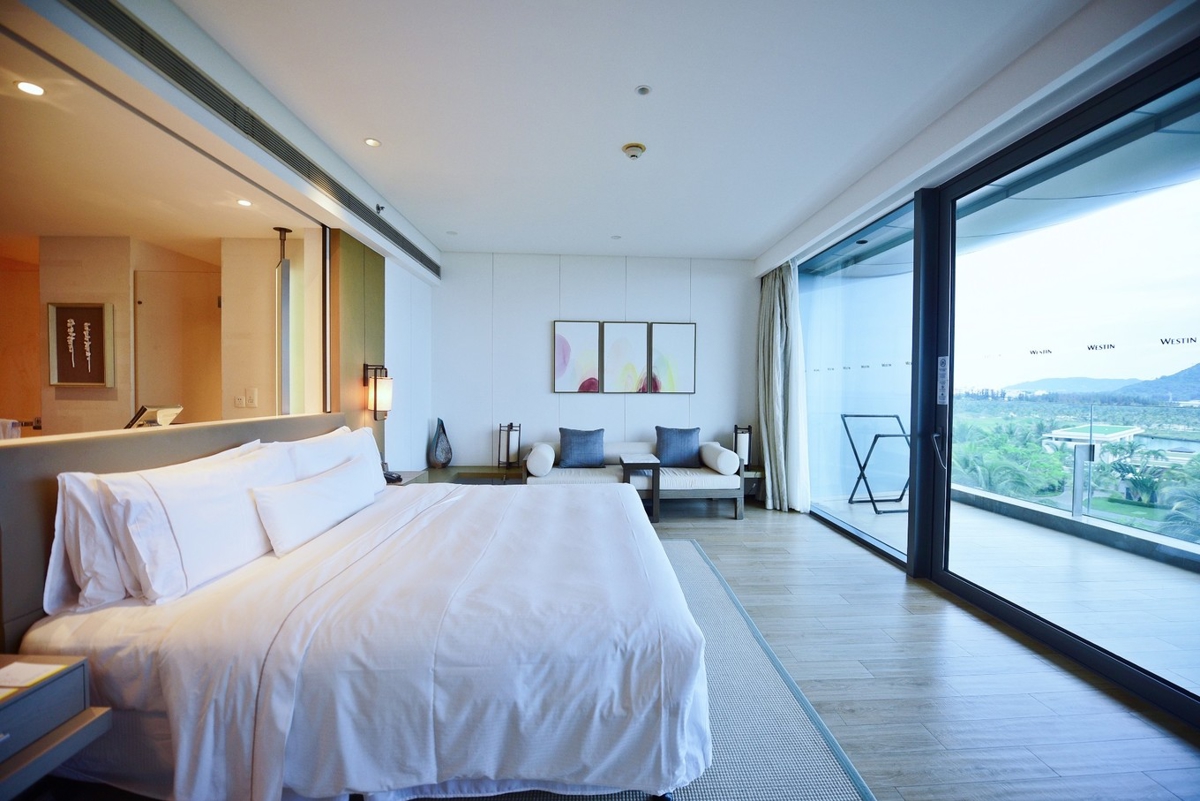 Tonight's stay: Westin Hotel (威斯汀酒店). This became my favorite hotel of the entire trip—360-degree unobstructed ocean views from every angle. A 2-meter king bed facing the sea means you wake up staring at the ocean. Even the bathtub and vanity area face the ocean with zero obstructions!