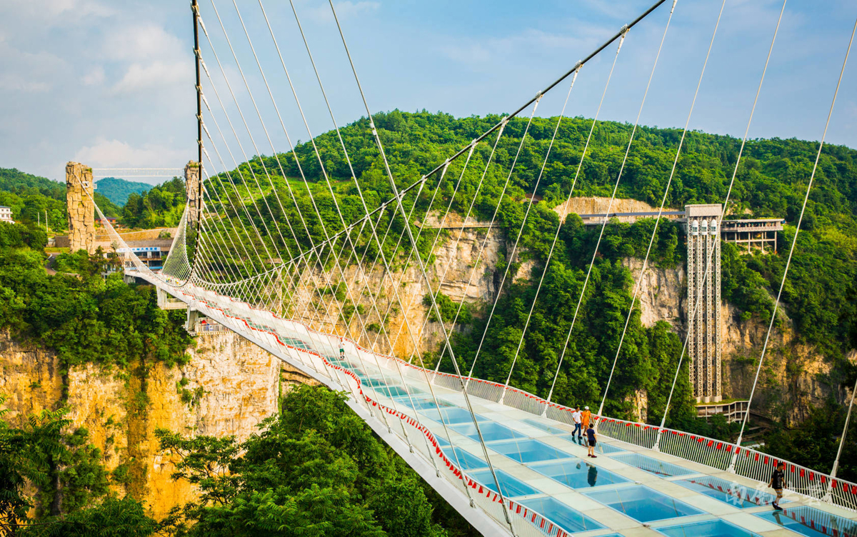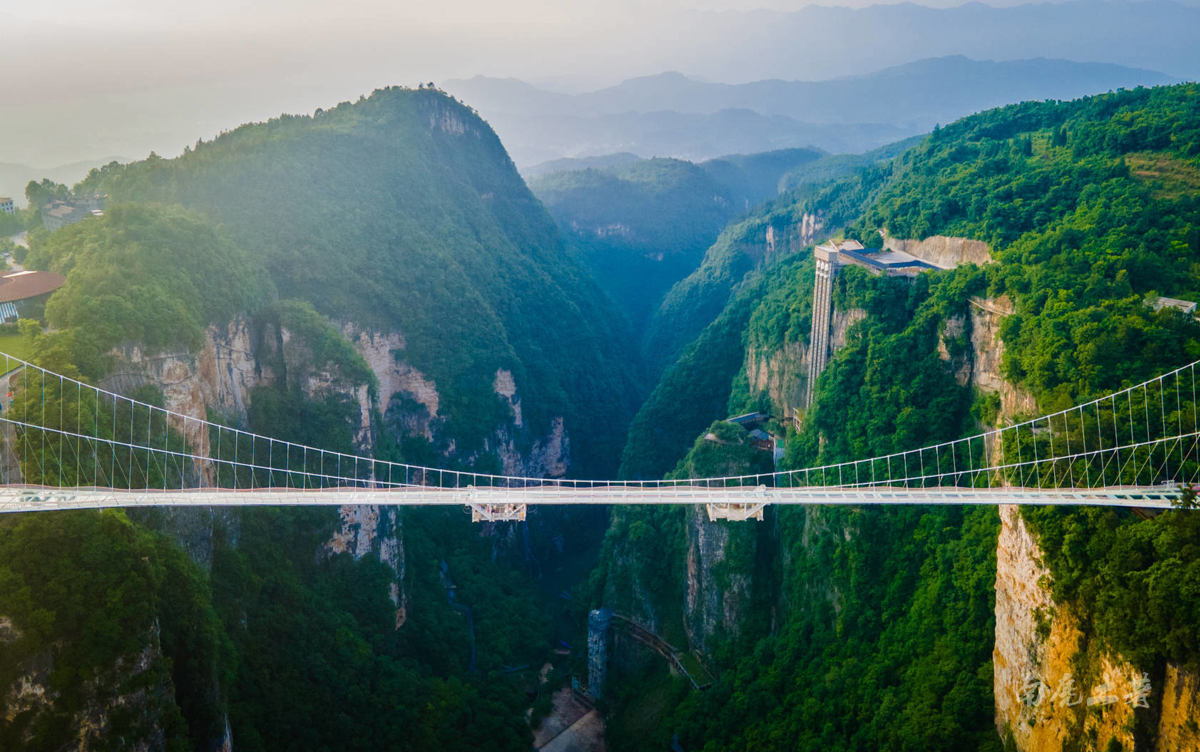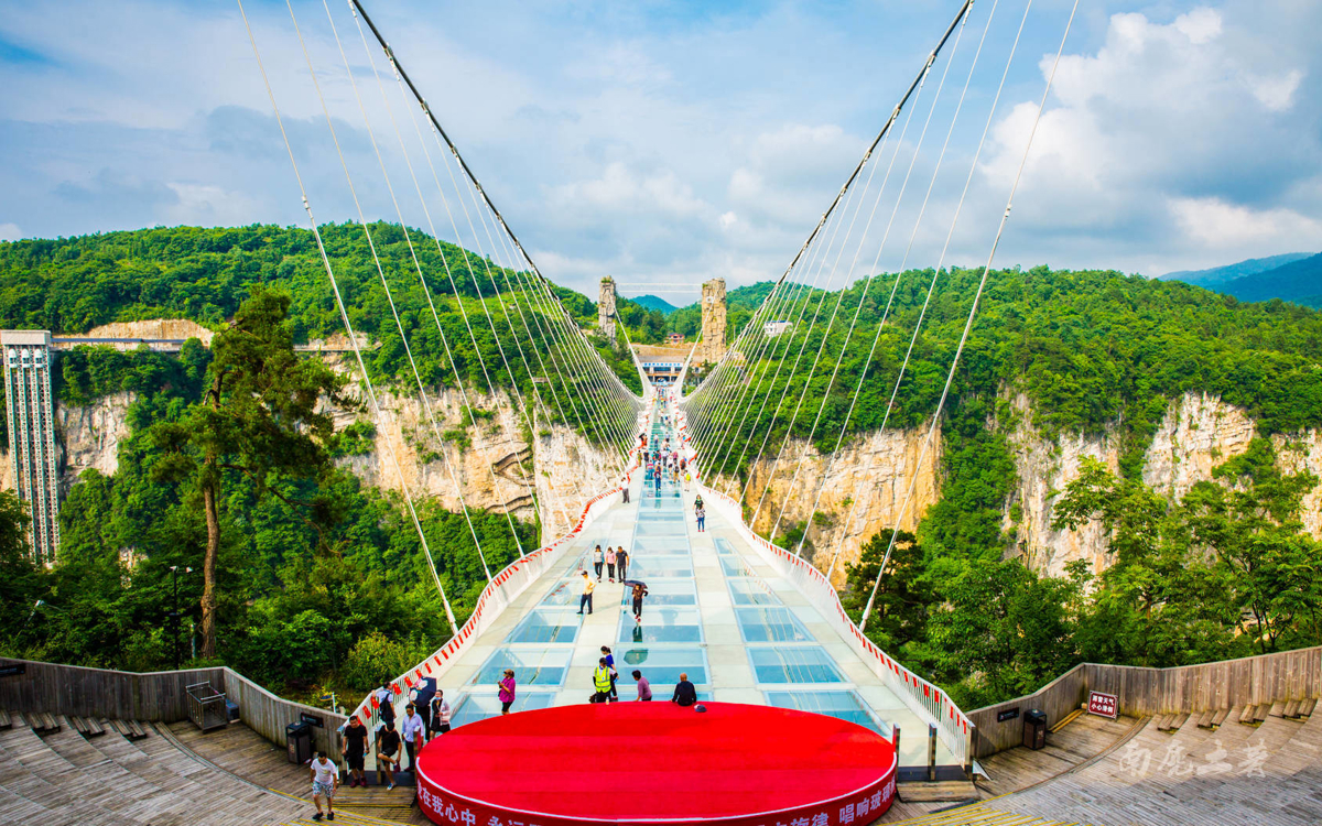 Zhangjiajie Grand Canyon Glass Bridge (张家界大峡谷玻璃桥): Built on the peaks on both sides of the grand canyon, this is the world's highest and longest glass bridge. The entire bridge deck is paved with transparent glass. Construction started in May 2015 with pressure tests, rail pull tests, and wind tunnel tests. It opened in August 2016 and was renamed 'Yuntiandu' (云天渡), though locals still call it 'Zhangjiajie Grand Canyon Glass Bridge.'
