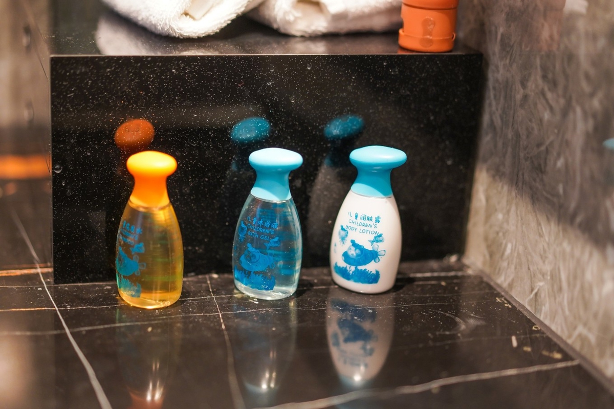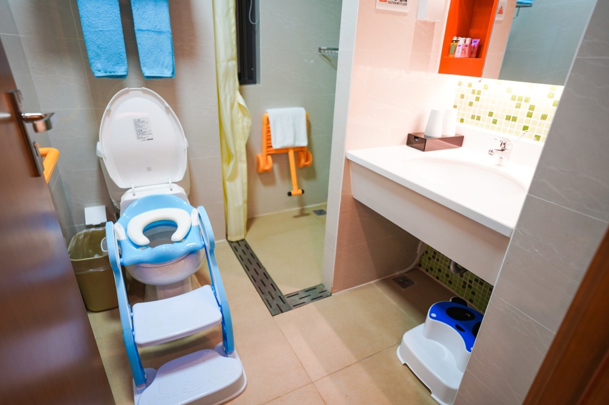 The bathrooms come equipped with child-sized toilets, and toiletries include baby-specific products—very thoughtful.