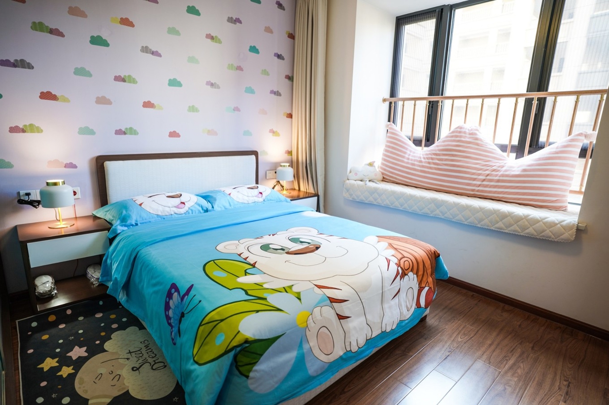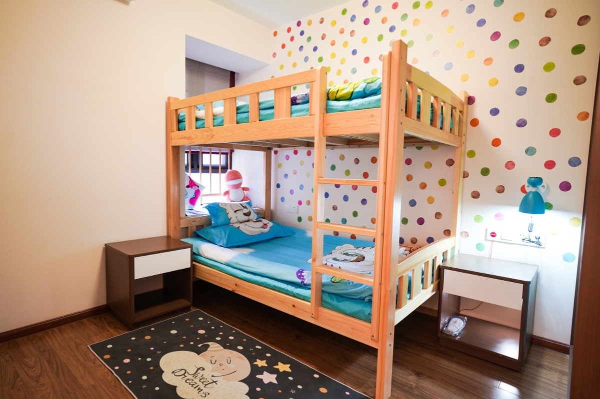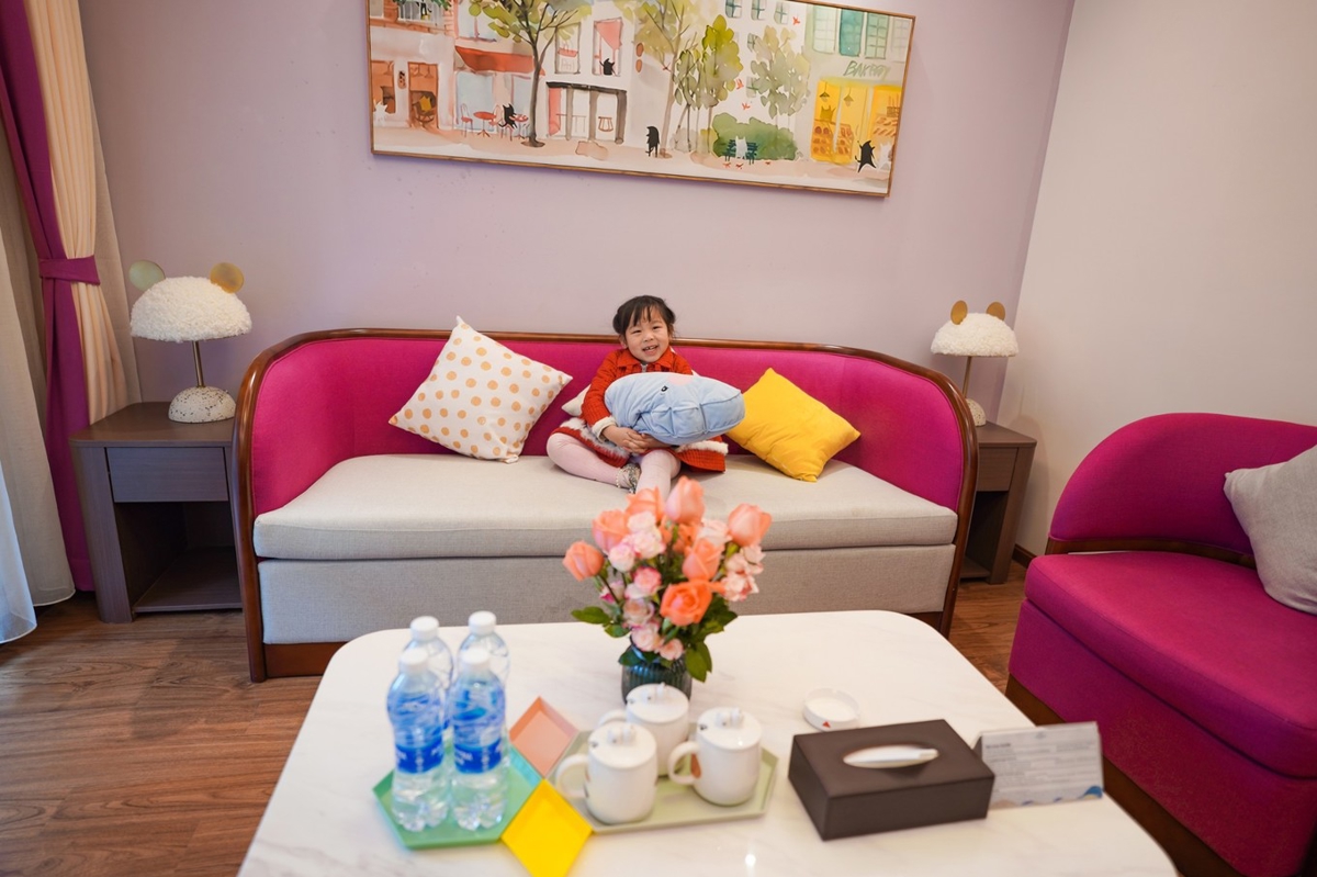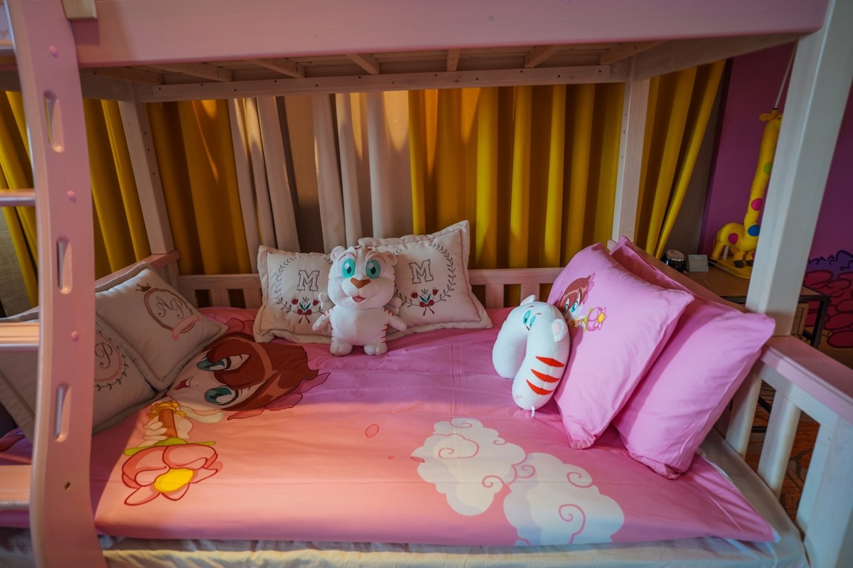 We stayed in the girls' room with our little one. Opening the door reveals a pink princess-style room. The room is very warmly decorated with a large bed and bunk beds, accommodating 2 adults and 2 children. There are also many toys, a tent, and stuffed animals for kids to play with on the floor.