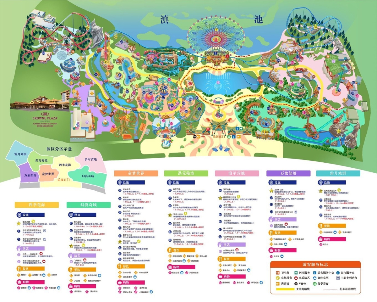 Colorful Yunnan Happy World is Yunnan's largest theme park. Unlike other theme parks elsewhere, it features unique Yunnan ethnic characteristics, using Ancient Yunnan culture as the background, incorporating minority cultures, Ancient Yunnan battlefields, and jungle secrets. It creates a theme park with 7 zones (Dream Childhood, Four Seasons Flower Sea,滇幻奇域, 万象部落, 滇军营地, 霜月寒洲, 洪荒秘境) and 81 attractions, each zone with its guardian deity: "Flying Tiger," "Elephant God," "Tiger God," "Eagle God," "Flower Spirit," "Stone Spirit," and "Bird Spirit."