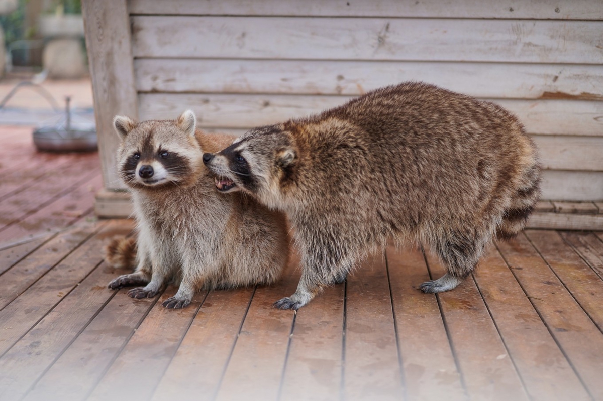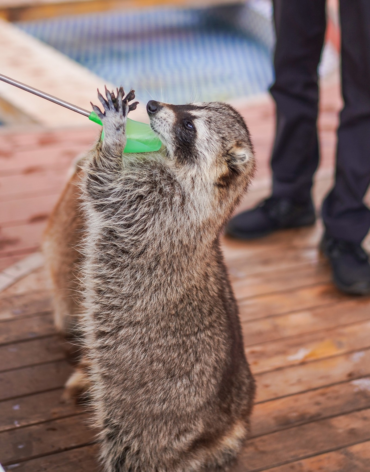 The raccoons here can also be fed. Although they look a little fierce, they're actually very tame. However, for safety, we used a long spoon to feed them.