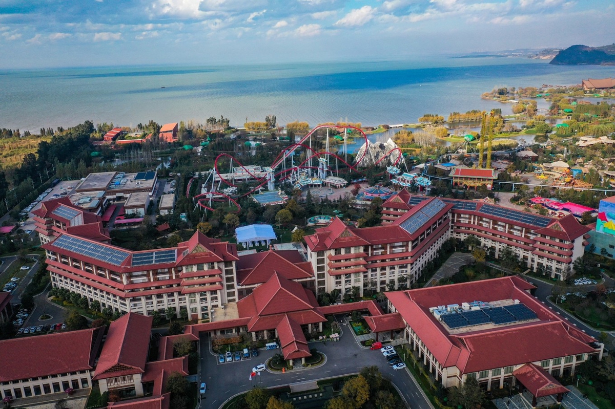 Outside the balcony is Colorful Yunnan Happy World, and further in the distance is Dianchi Lake—the view is wonderful.