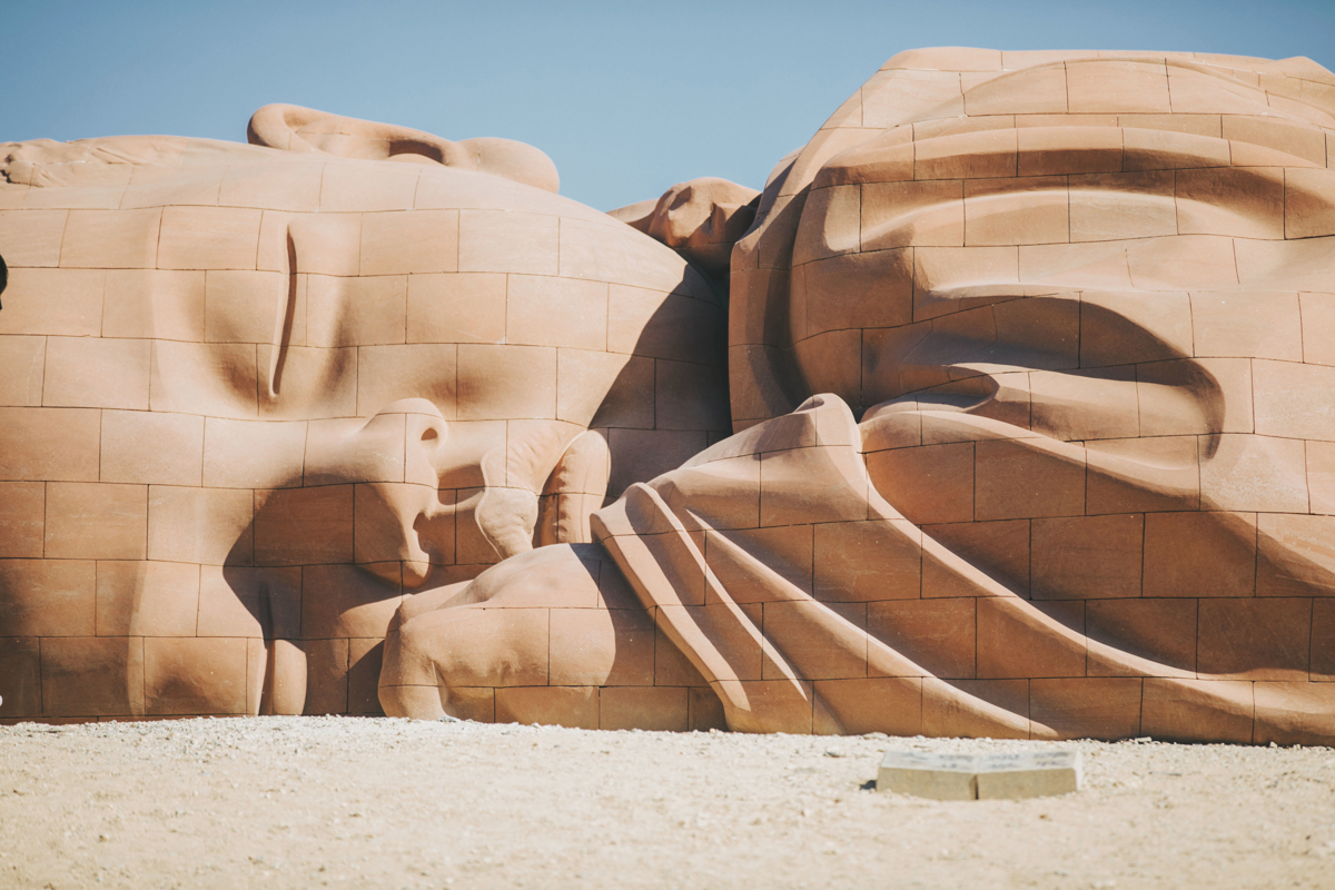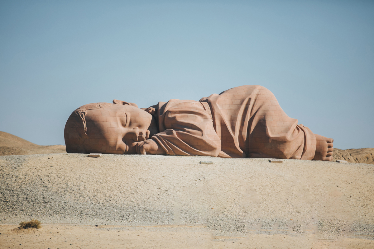We packed our Honda Elysion—spacious enough to feel like a moving home—and headed west from Jiuquan (酒泉) toward Dunhuang. The journey passed by the "Son of the Earth" (大地之子), a massive 15-meter-long baby sculpture lying in the desert, arms outstretched as if cuddling the earth itself.