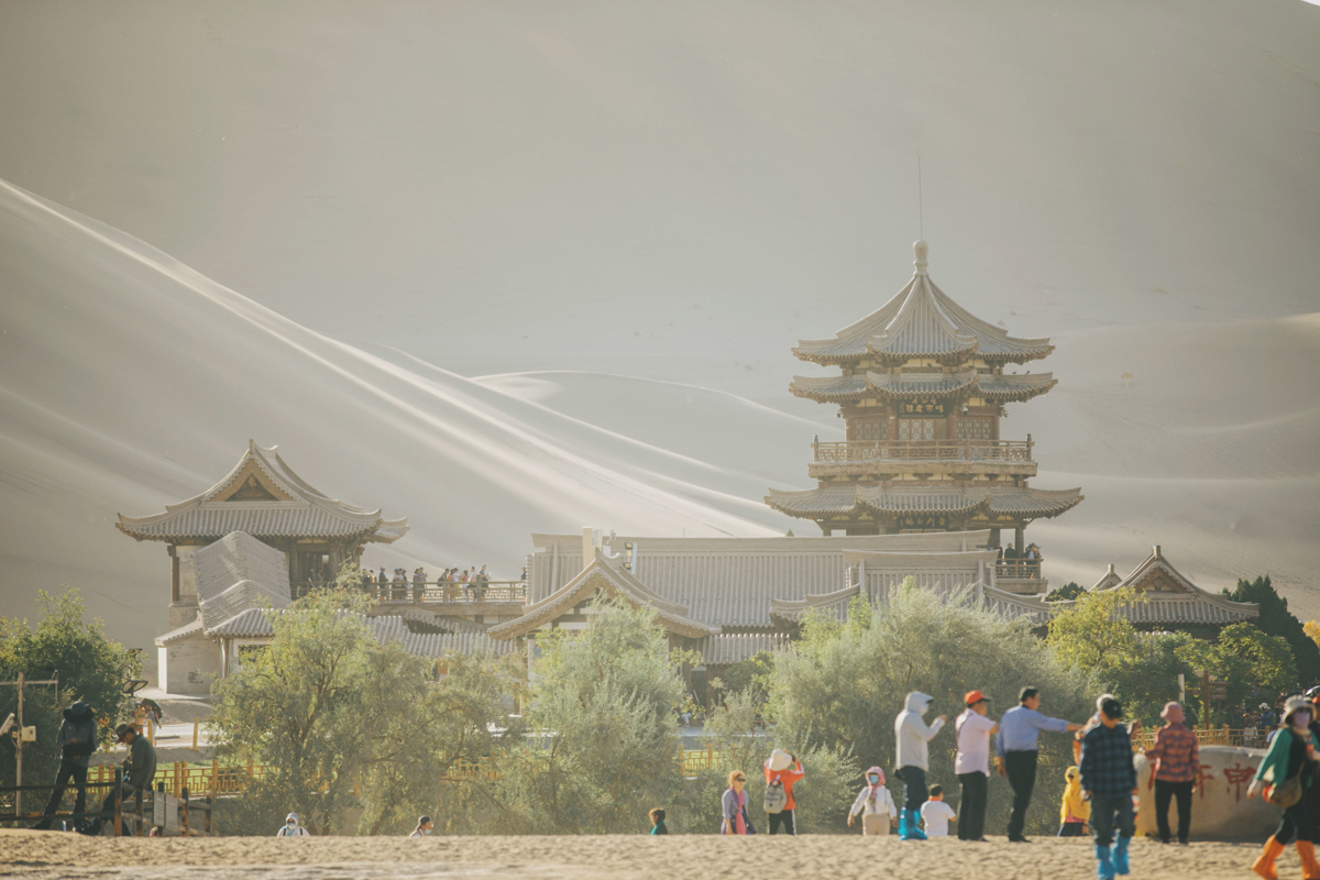 Chinese writer Yu QiuYu's description of Crescent Spring is poetry: "Vast desert, flowing water—nothing extraordinary. But this one湾 in the dunes, this stillness amid chaos, this scene in barren land, this slope's descent—these capture nature's rhythm and creation's artistry."