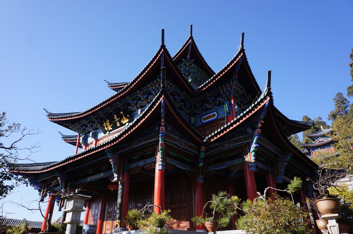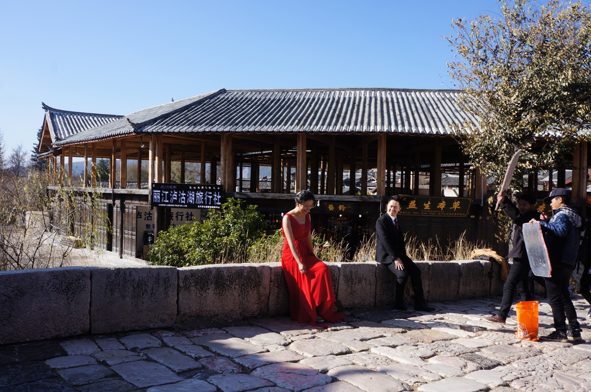 Crossing Sifang Square (四方街), I watched couples shivering in beautiful wedding dresses for photos at Dashi Bridge (大石桥). Then I followed the creek to Longtan Temple (龙潭寺). I wanted to climb the mountain for a panoramic town view, but halfway up, there was no one around. It was nearly Chinese New Year, and I remembered my husband's warning: "Be careful out there..." I turned back.