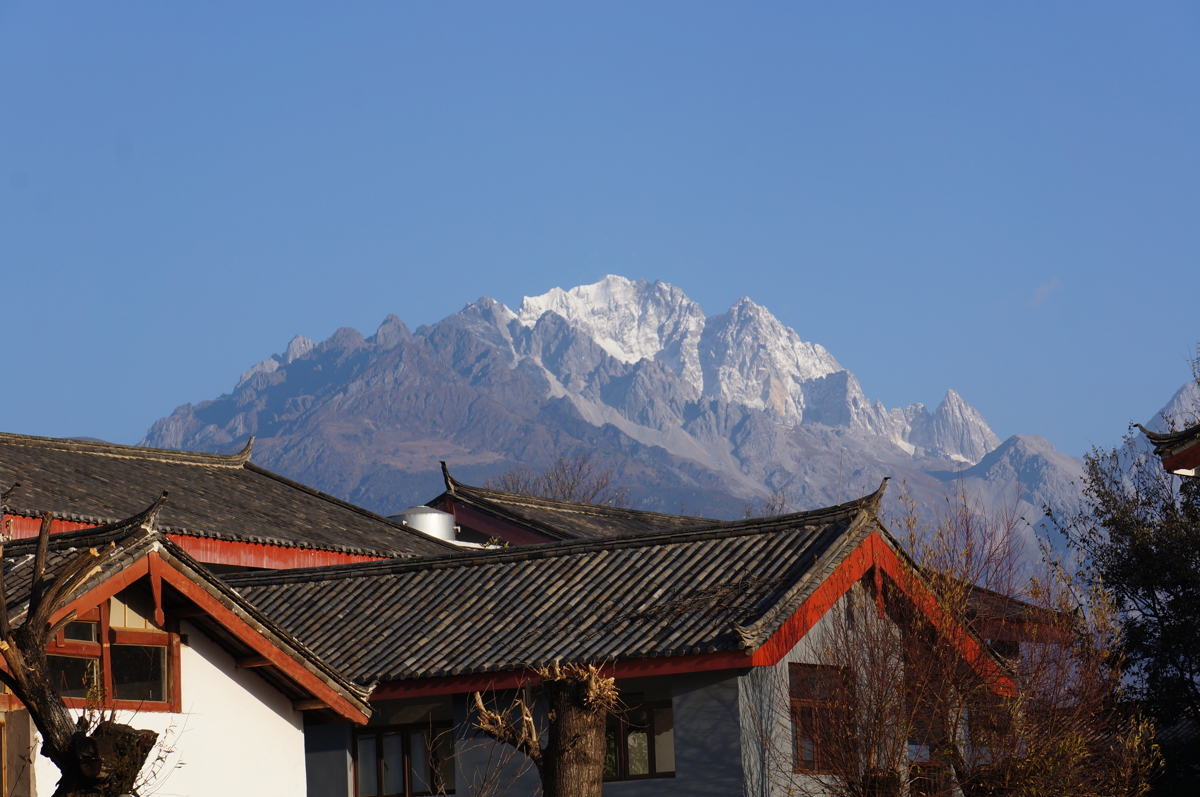 The flight via Kunming landed in brilliant sunshine. As we descended, the famous Jade Dragon Snow Mountain (玉龙雪山) came into view. I'd booked a quieter inn in Shuhe Town (束河镇), and the driver picked me up. The innkeeper's first reaction: "You came alone?" Apparently solo female travelers aren't uncommon here—I saw several on my flight.