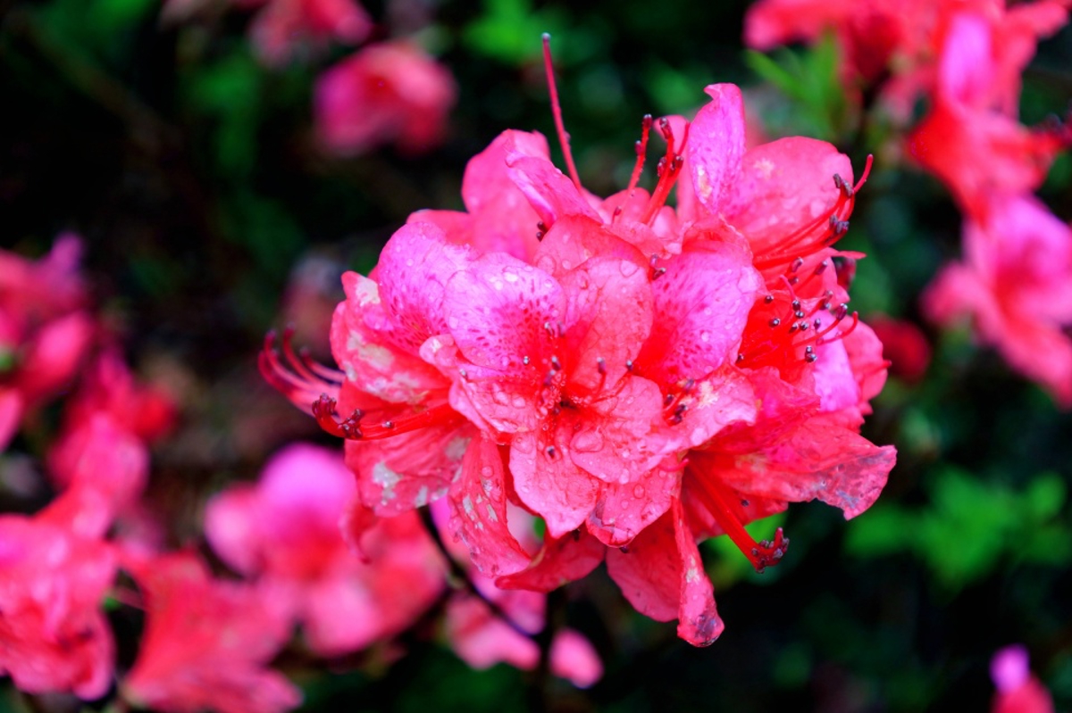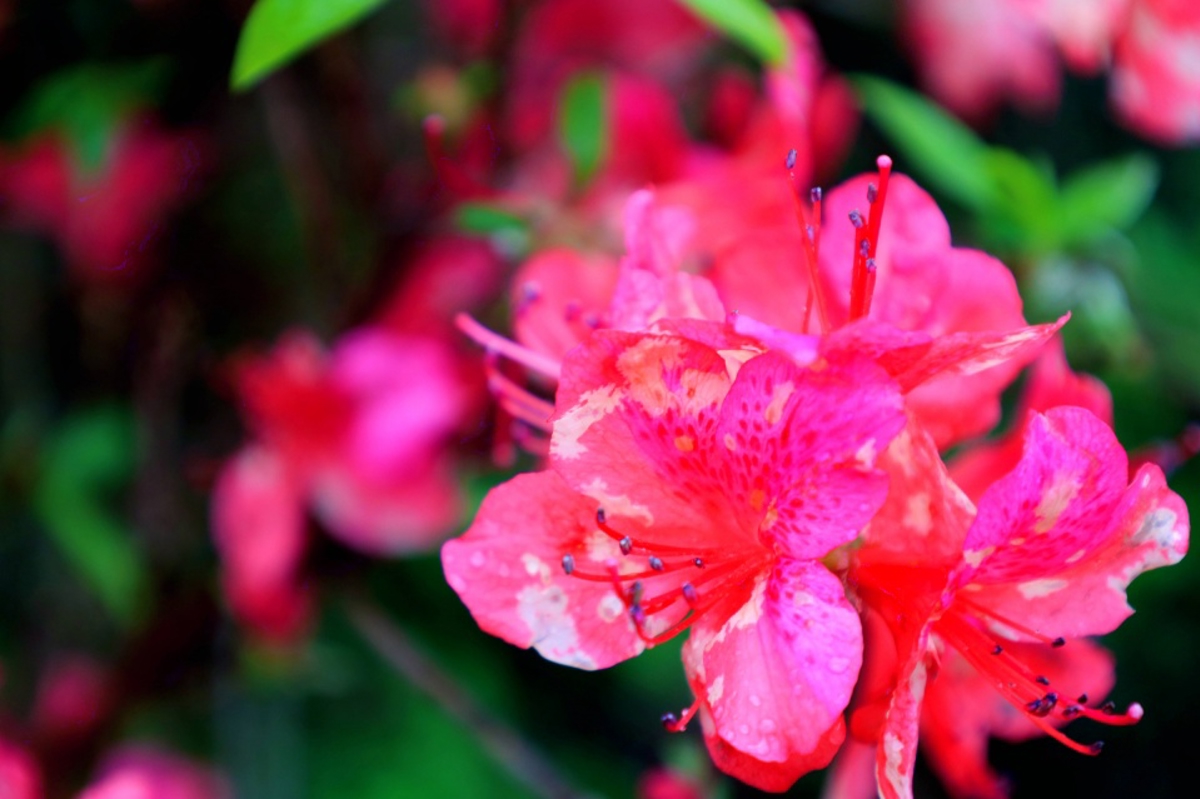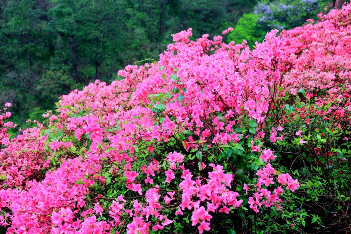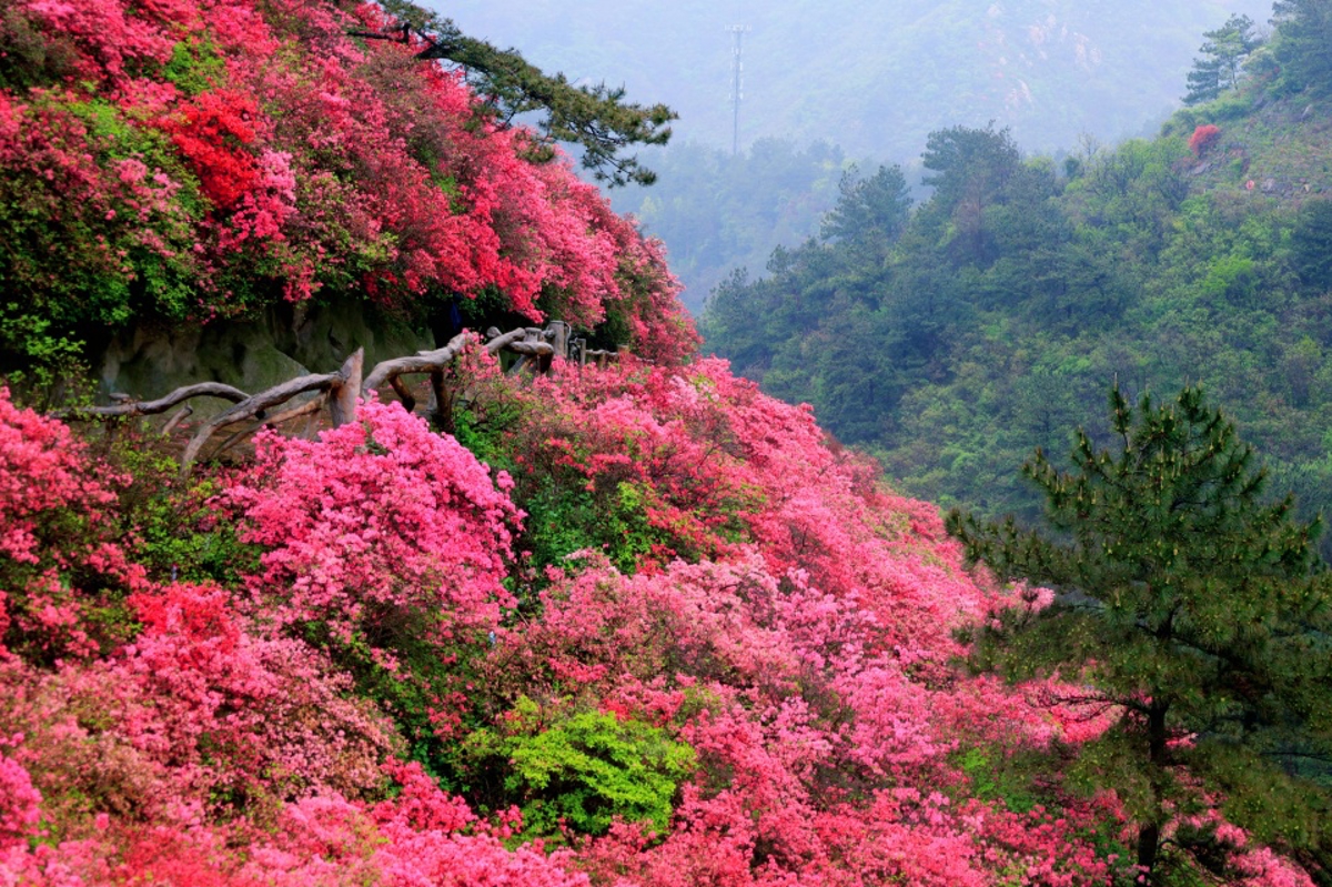 Following the wooden boardwalk, the azaleas appear in clusters and sprays—like flames dancing, red silk waving, or dawn breaking over the mountain. Nature has painted spring in bold strokes here.